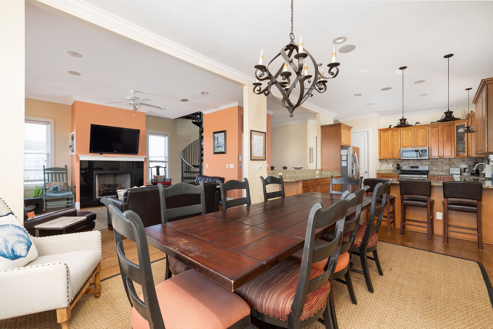 The spacious kitchen is equipped with modern appliances, a breakfast bar, and a dining table that seats up to 10 guests comfortably. Perfect for family meals or entertaining.