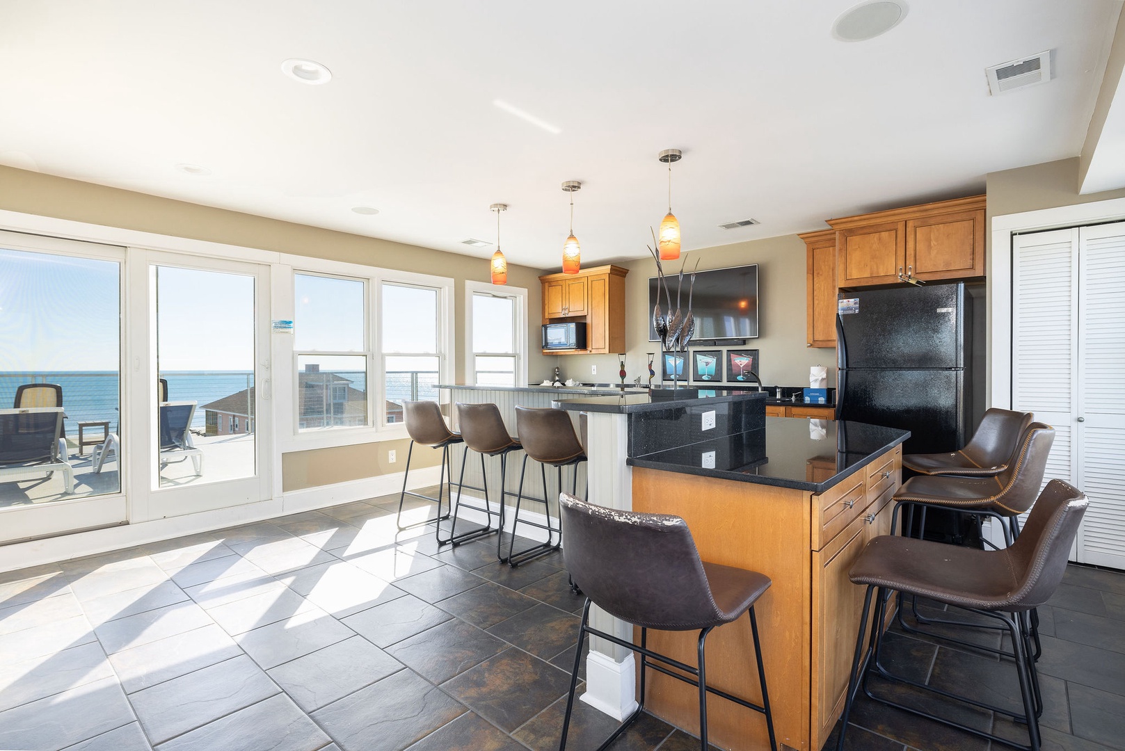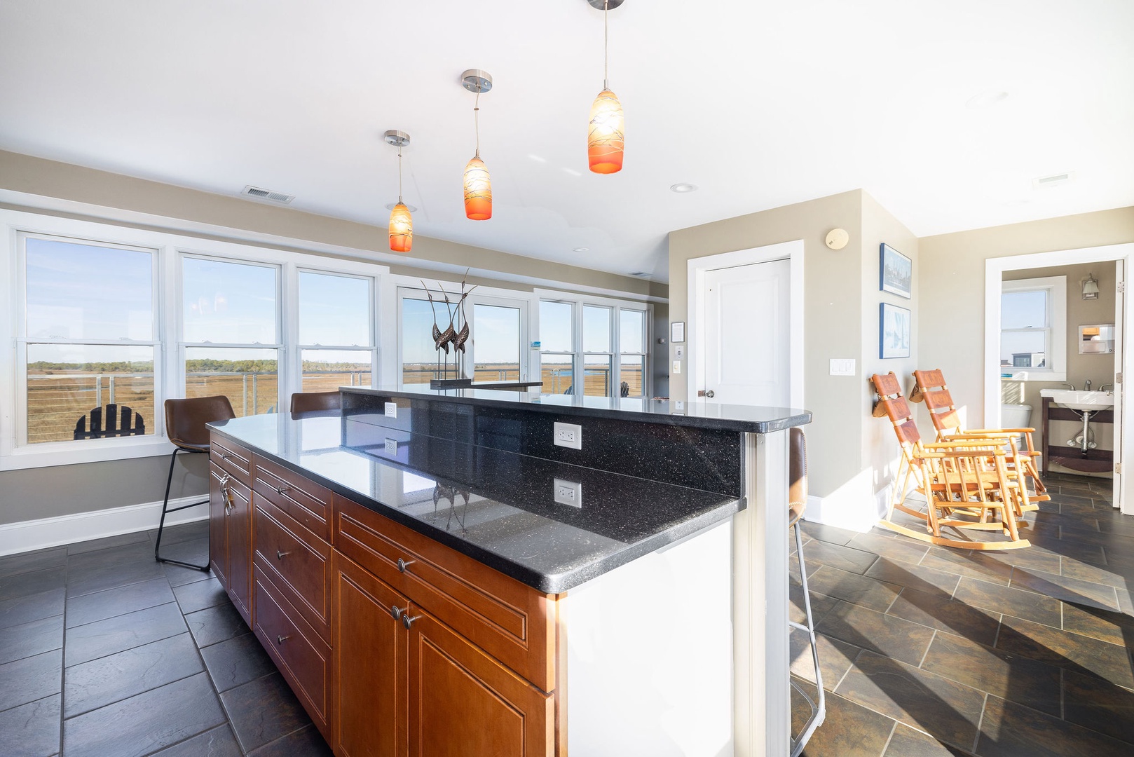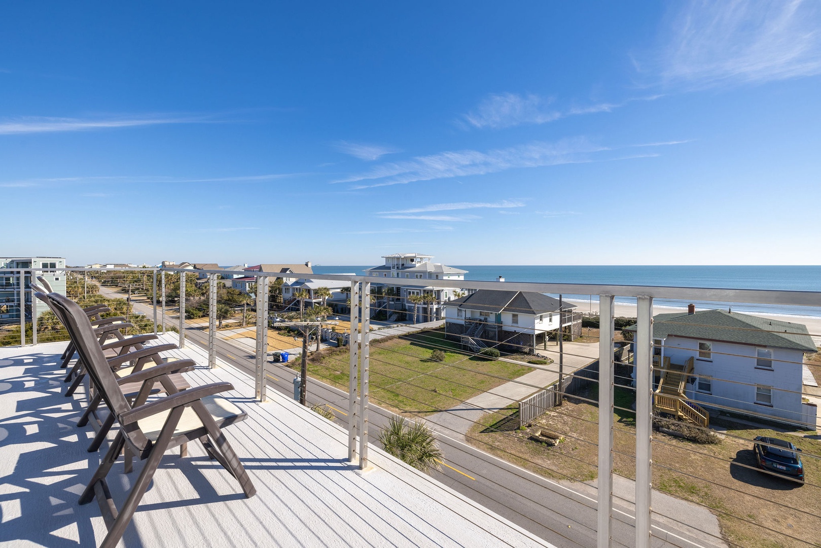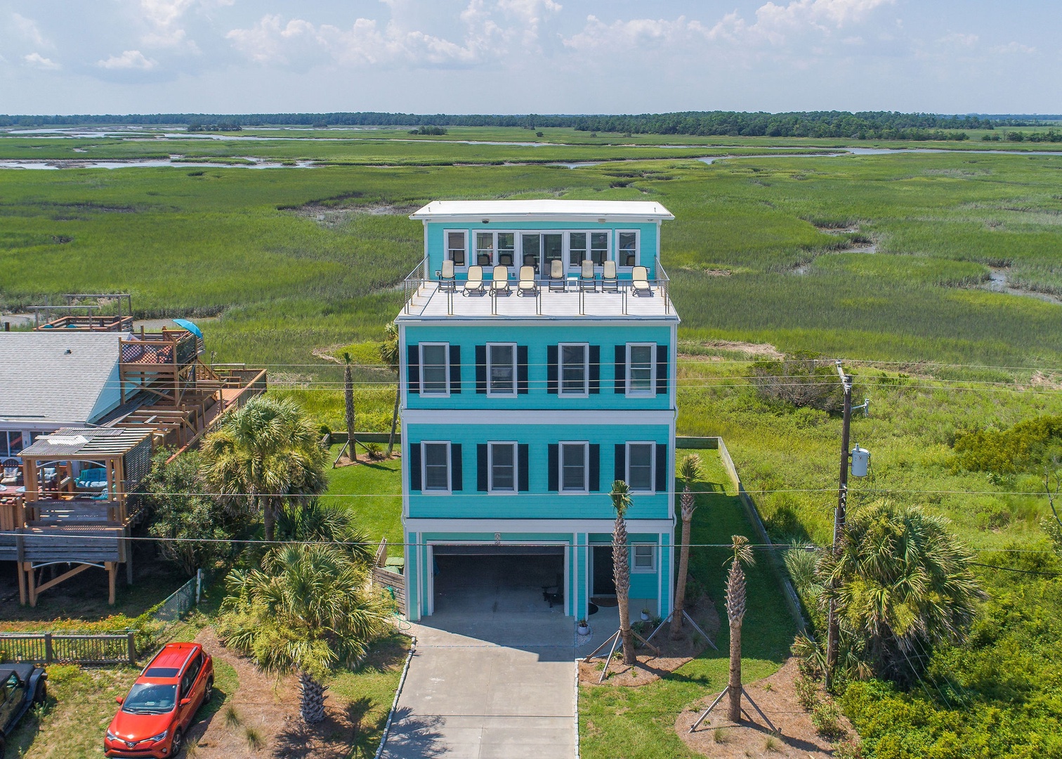 Multiple decks offering stunning views of the ocean and marsh.