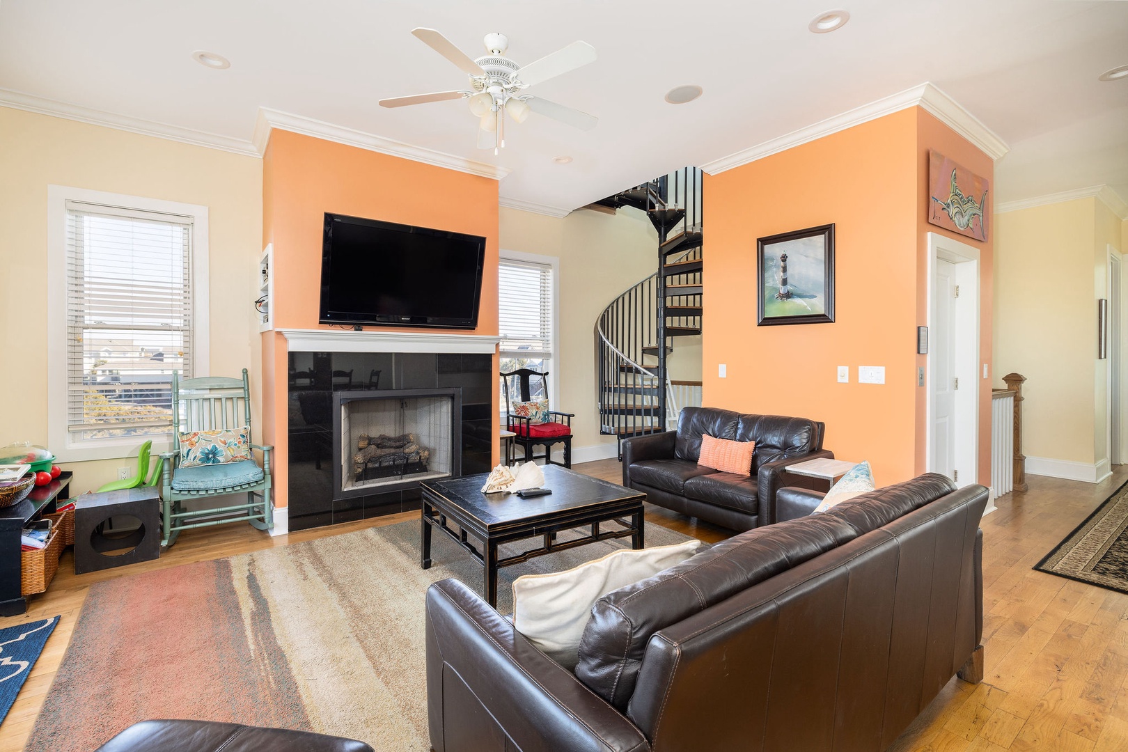 The second-floor living area features 10-foot ceilings, ample seating, and a large Smart TV, creating a welcoming space for guests to gather and relax.