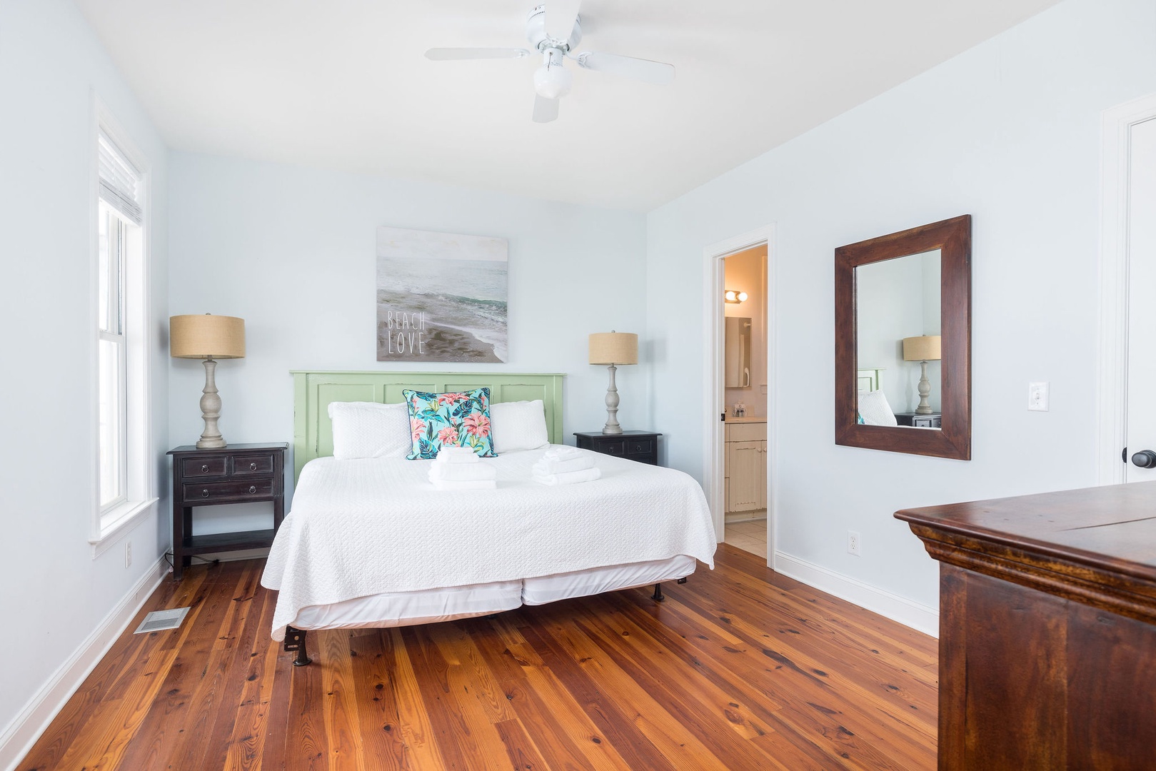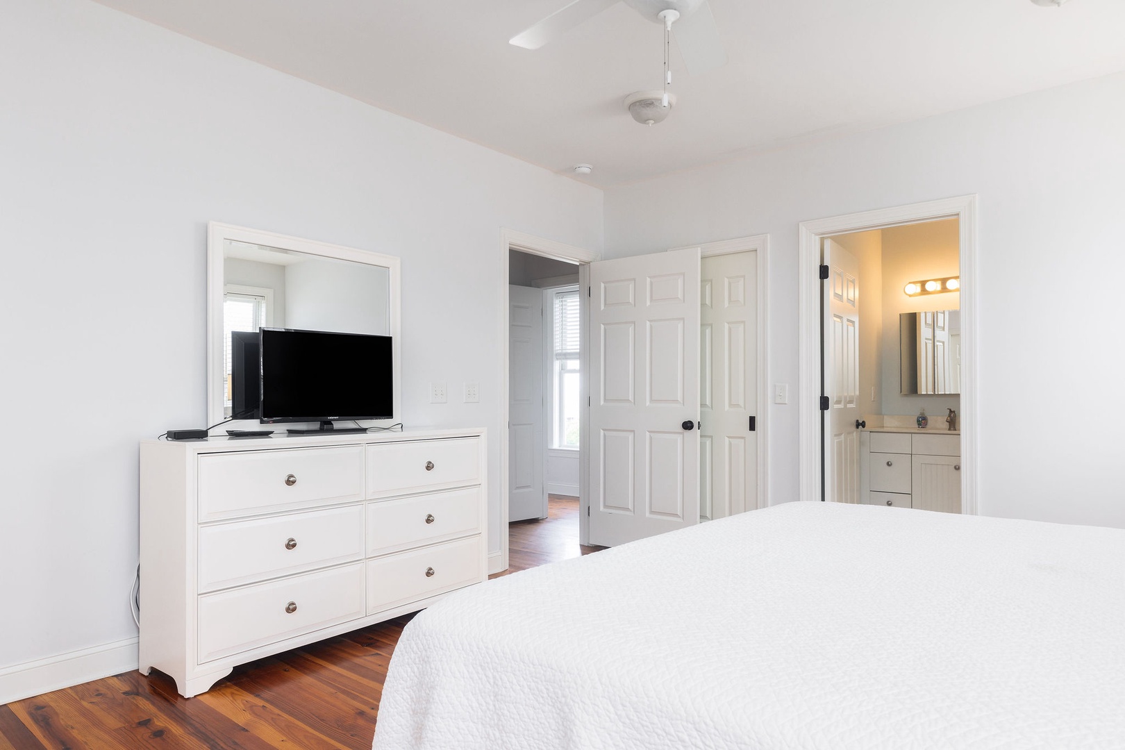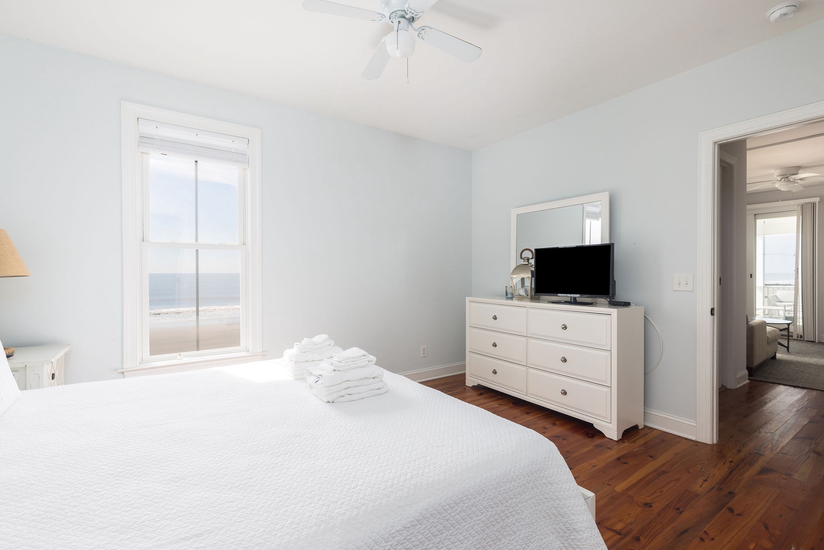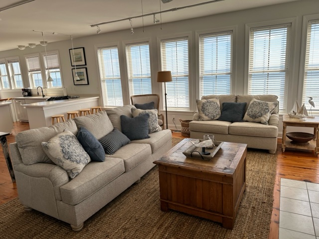 Second Floor: Open-concept great room with ocean and river views. The dining area features a large family-sized table and offers beautiful sunset views over the Folly River. The kitchen is fully equipped with a gas range, ideal for preparing meals. The second primary bedroom on this floor includes a king-size bed, flat-screen TV, and two full bathrooms.