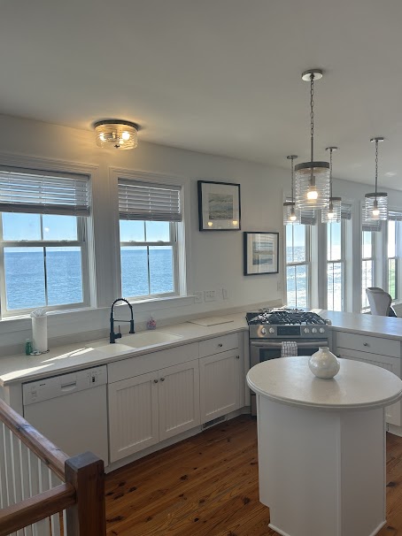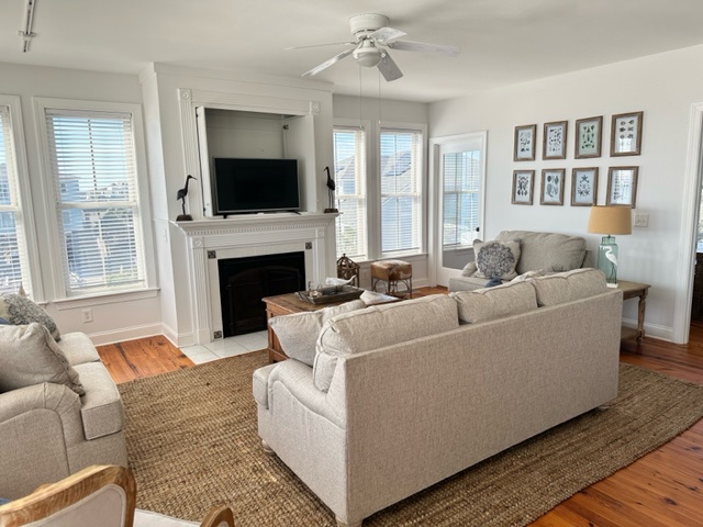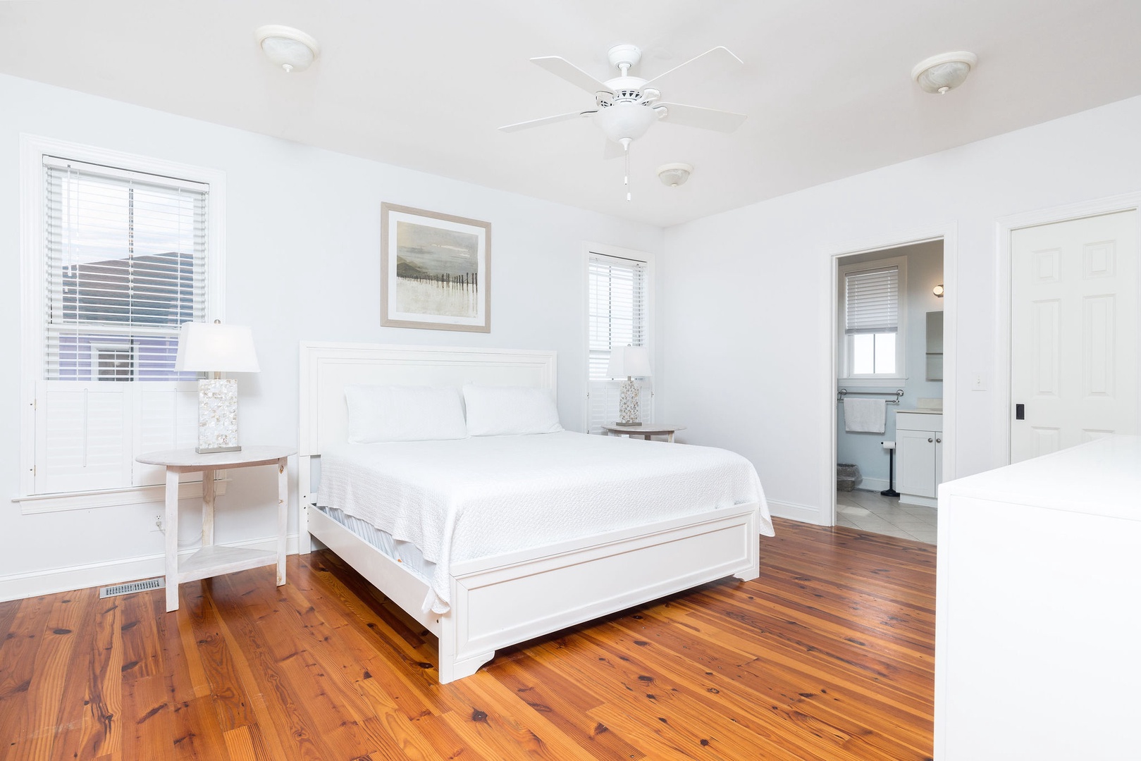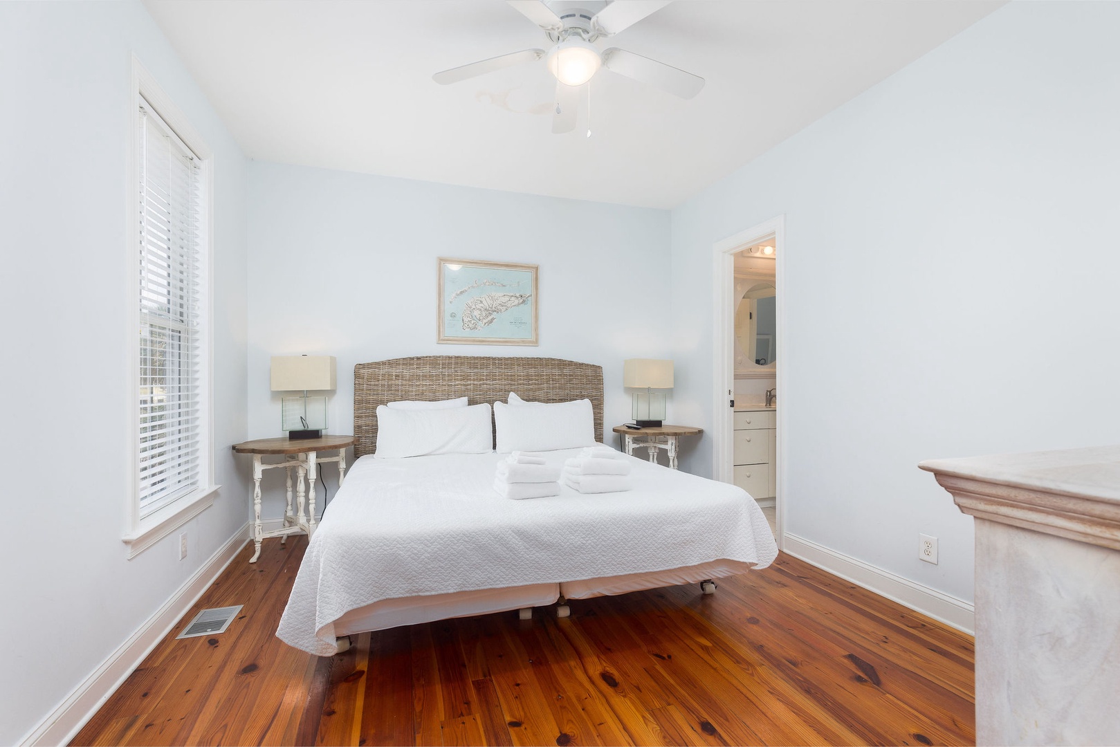 Second Floor: Open-concept great room with ocean and river views. The dining area features a large family-sized table and offers beautiful sunset views over the Folly River. The kitchen is fully equipped with a gas range, ideal for preparing meals. The second primary bedroom on this floor includes a king-size bed, flat-screen TV, and two full bathrooms.