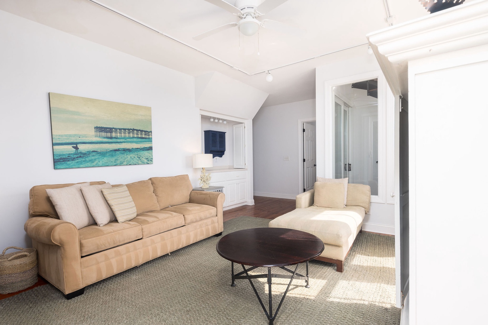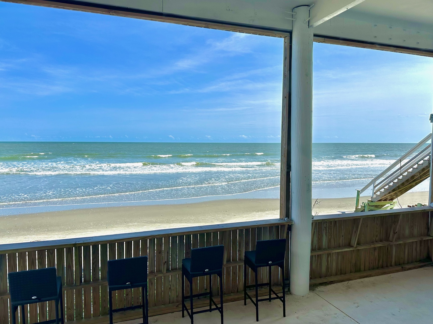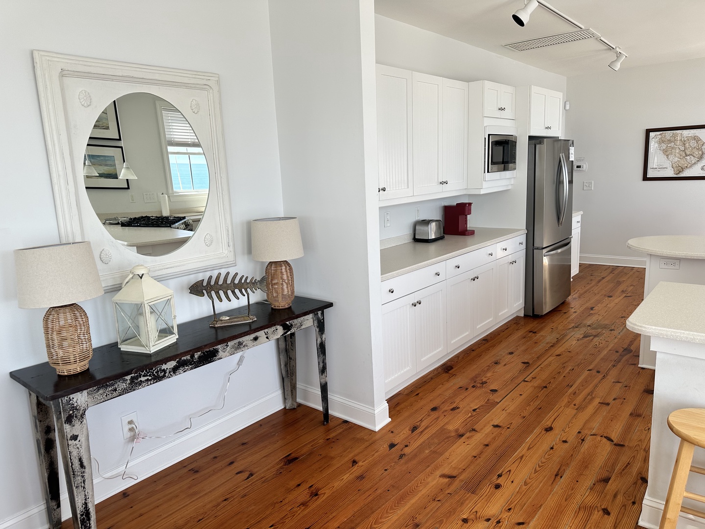 Third Floor: Wet bar area with a mini-fridge and access to the incredible rooftop deck. The deck offers panoramic views of the ocean, Morris Island Lighthouse, Sullivan's Island Lighthouse, and the Cooper River Bridge, as well as stunning sunrises and sunsets.