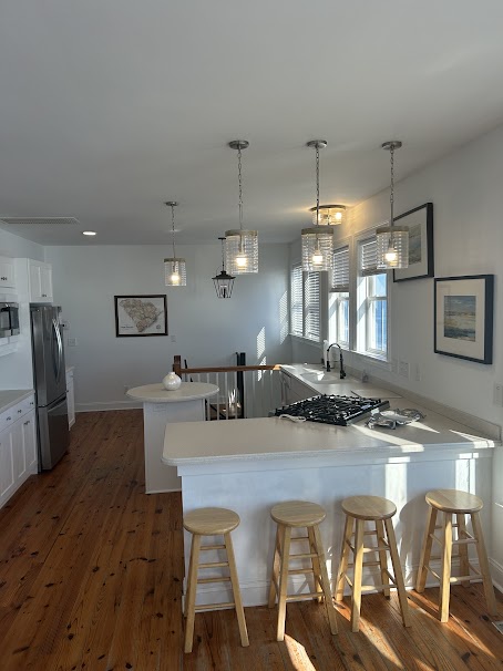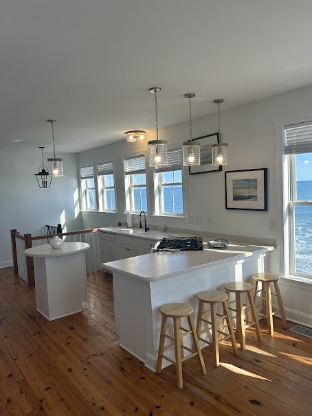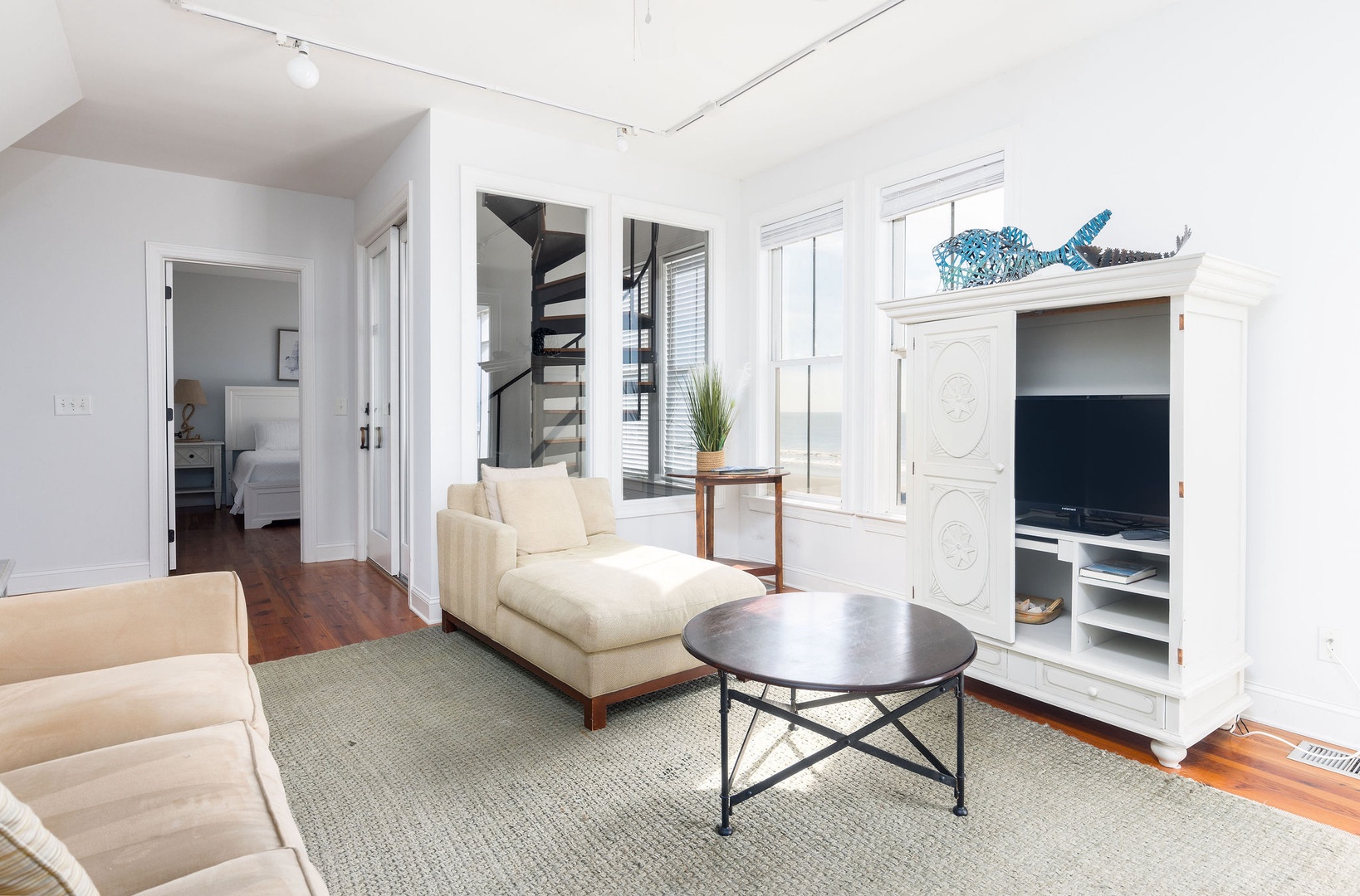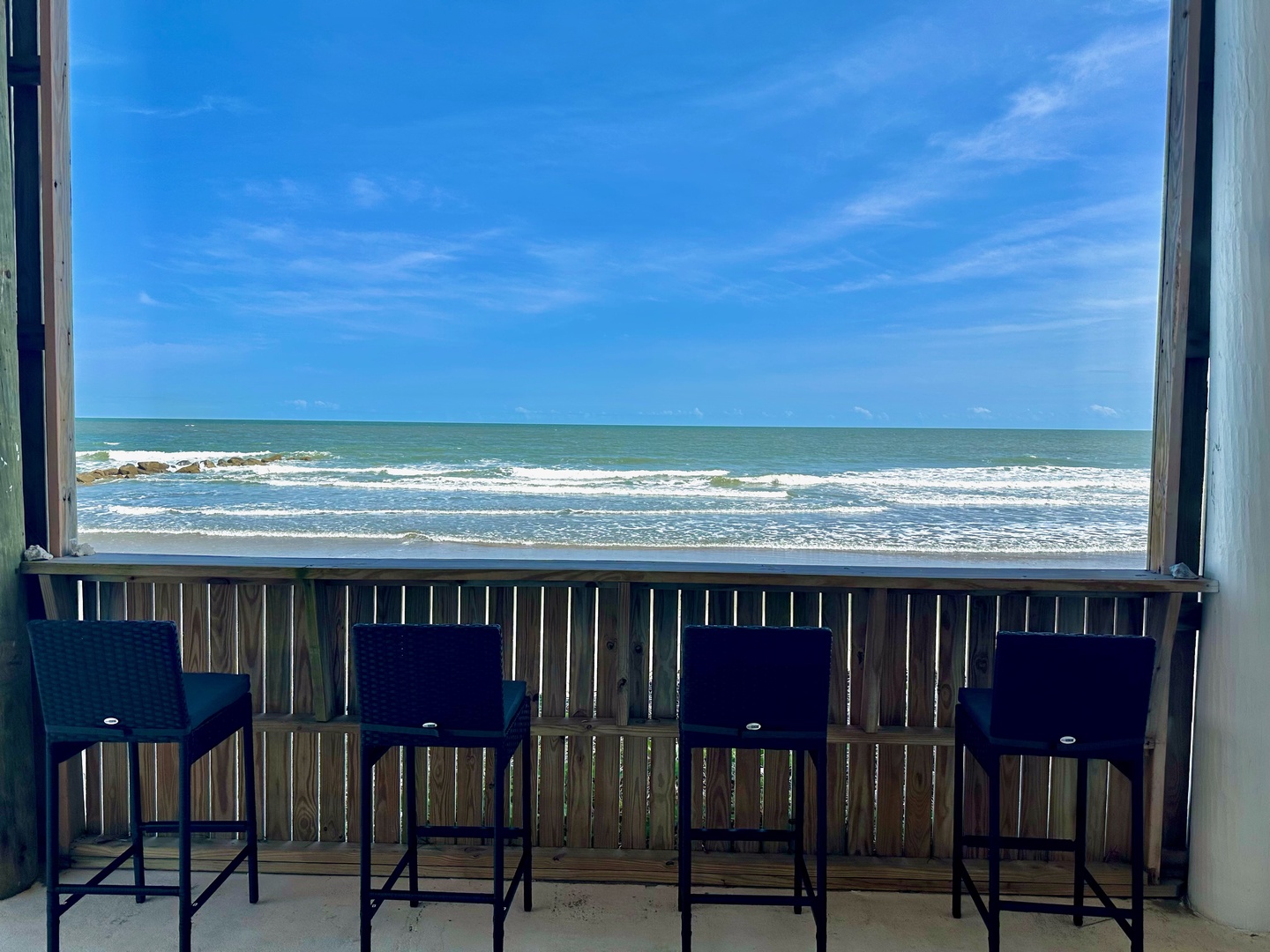 Third Floor: Wet bar area with a mini-fridge and access to the incredible rooftop deck. The deck offers panoramic views of the ocean, Morris Island Lighthouse, Sullivan's Island Lighthouse, and the Cooper River Bridge, as well as stunning sunrises and sunsets.