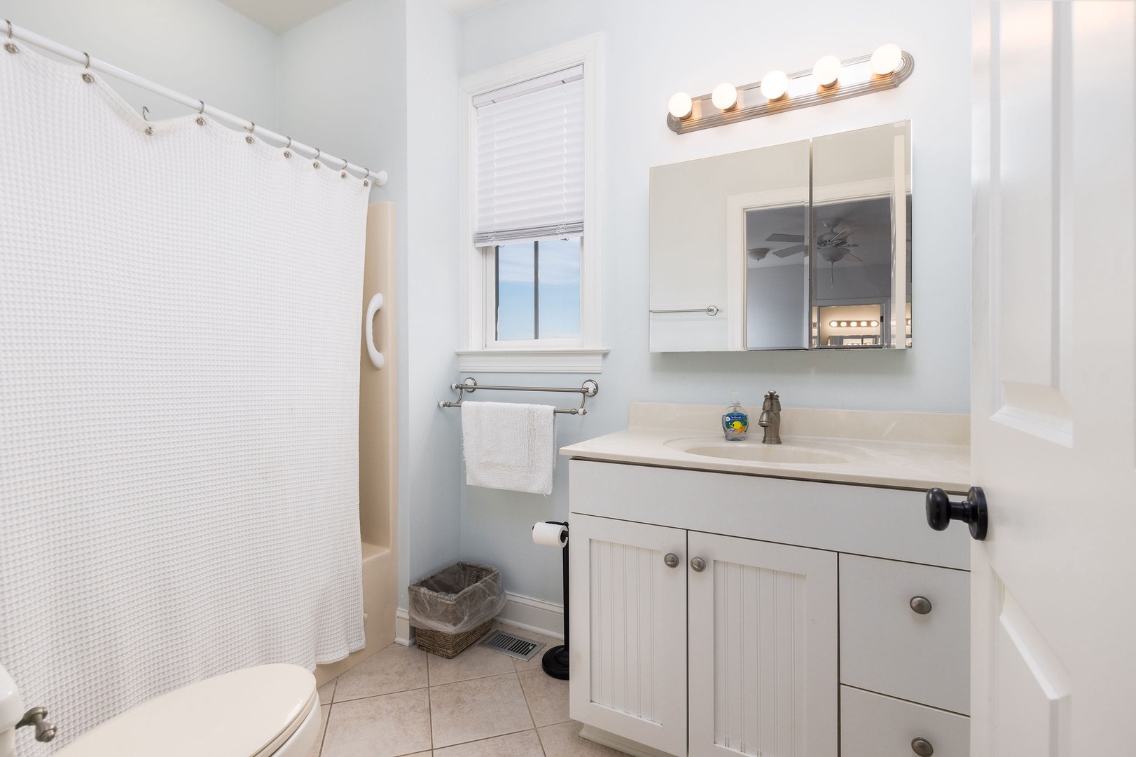 First Floor: Three bedrooms, all with king-size beds. Two bedrooms share a bathroom with access from both rooms, while the ocean-facing primary suite has a private full bathroom. The living area includes a sleeper sofa, wet bar, flat-screen TV, and access to the ocean-facing deck.