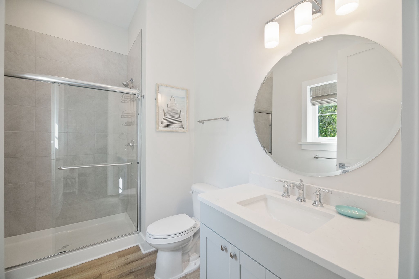 Four full bathrooms featuring a mix of bathtubs and walk-in showers provide convenience and comfort for all guests.