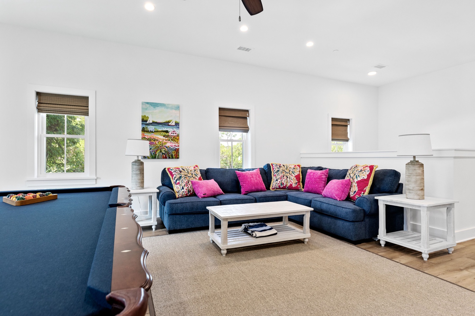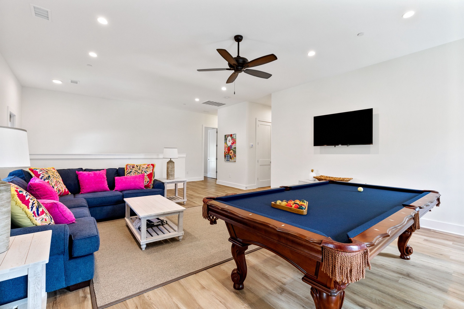 The second floor features a game room with a pool table, Smart TV, and comfortable seating, providing the perfect space for kids and adults alike.
