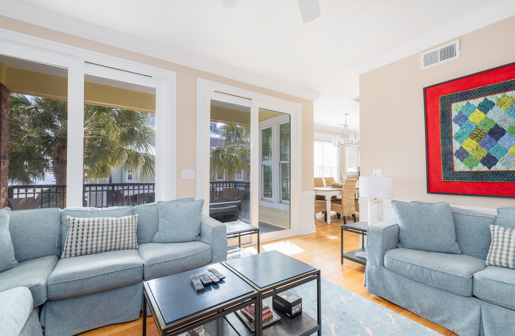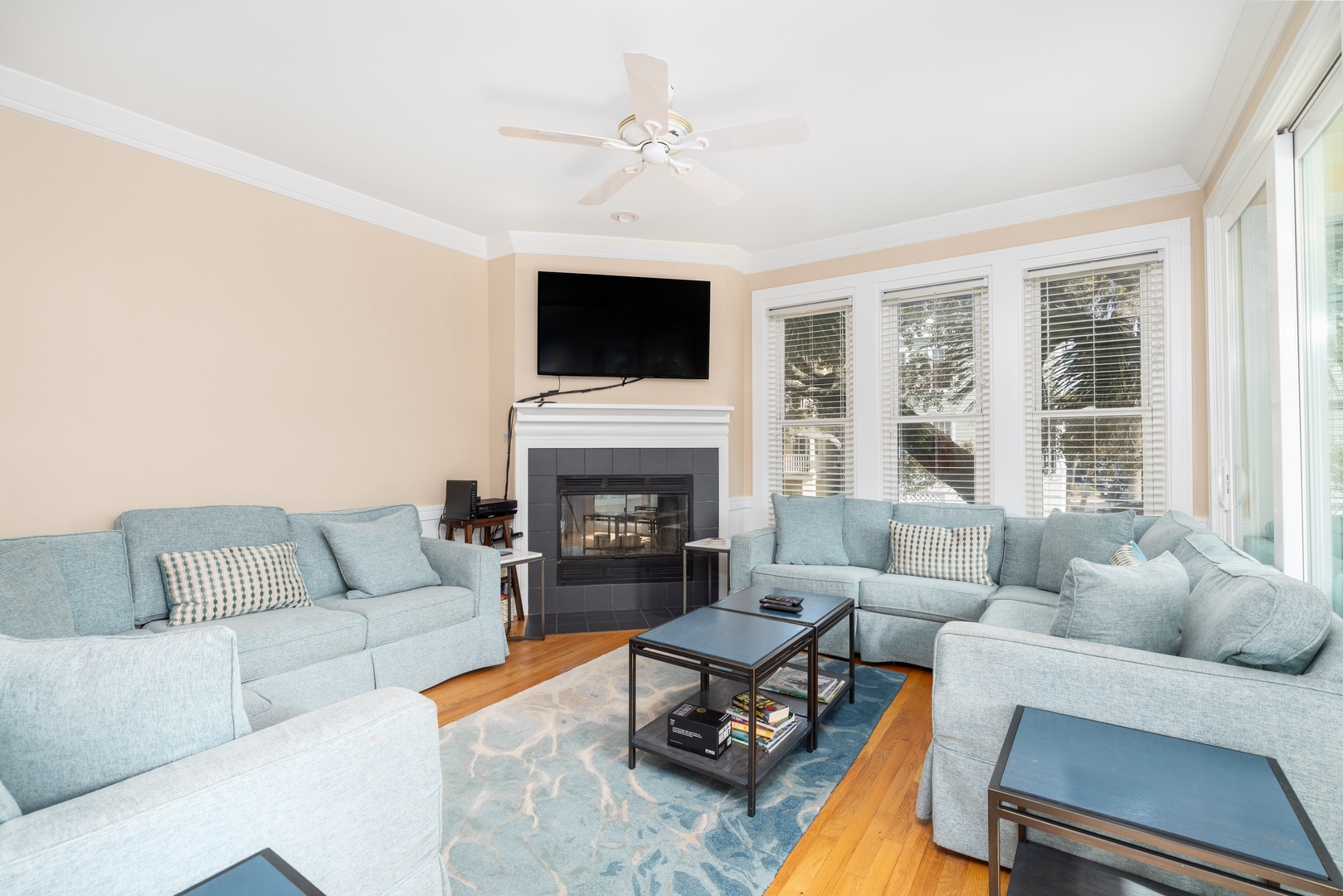 Spacious and comfortable living room with a large flat-screen TV, ample seating, and access to a first-floor porch overlooking the North croquet lawn.