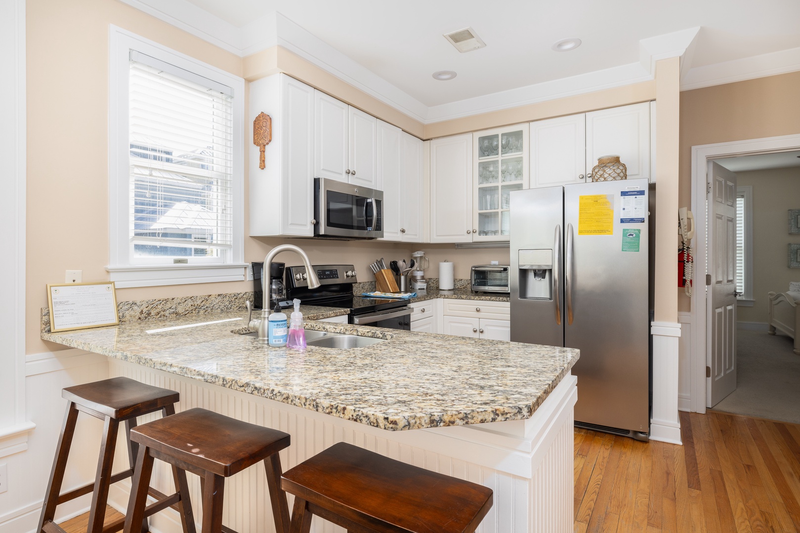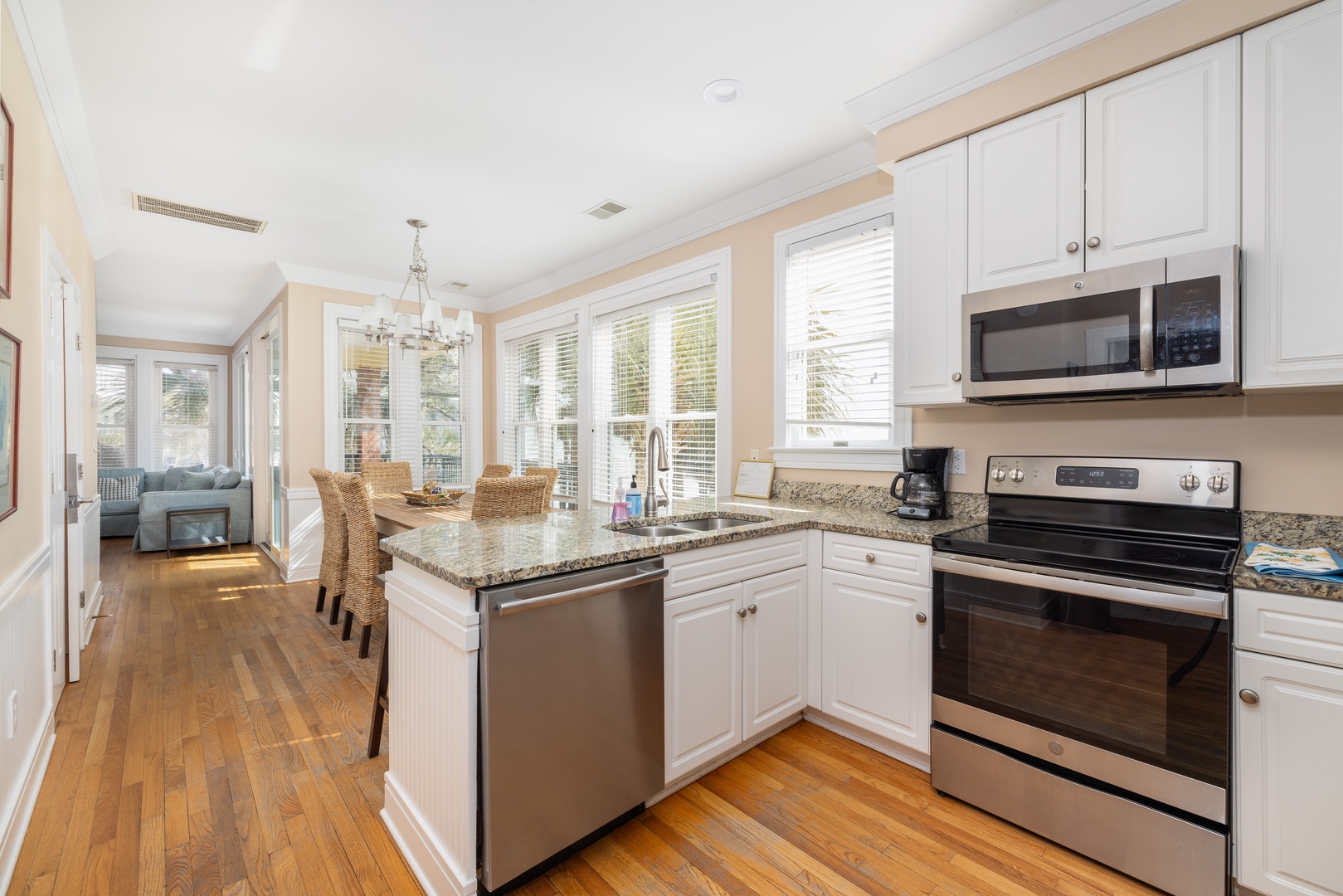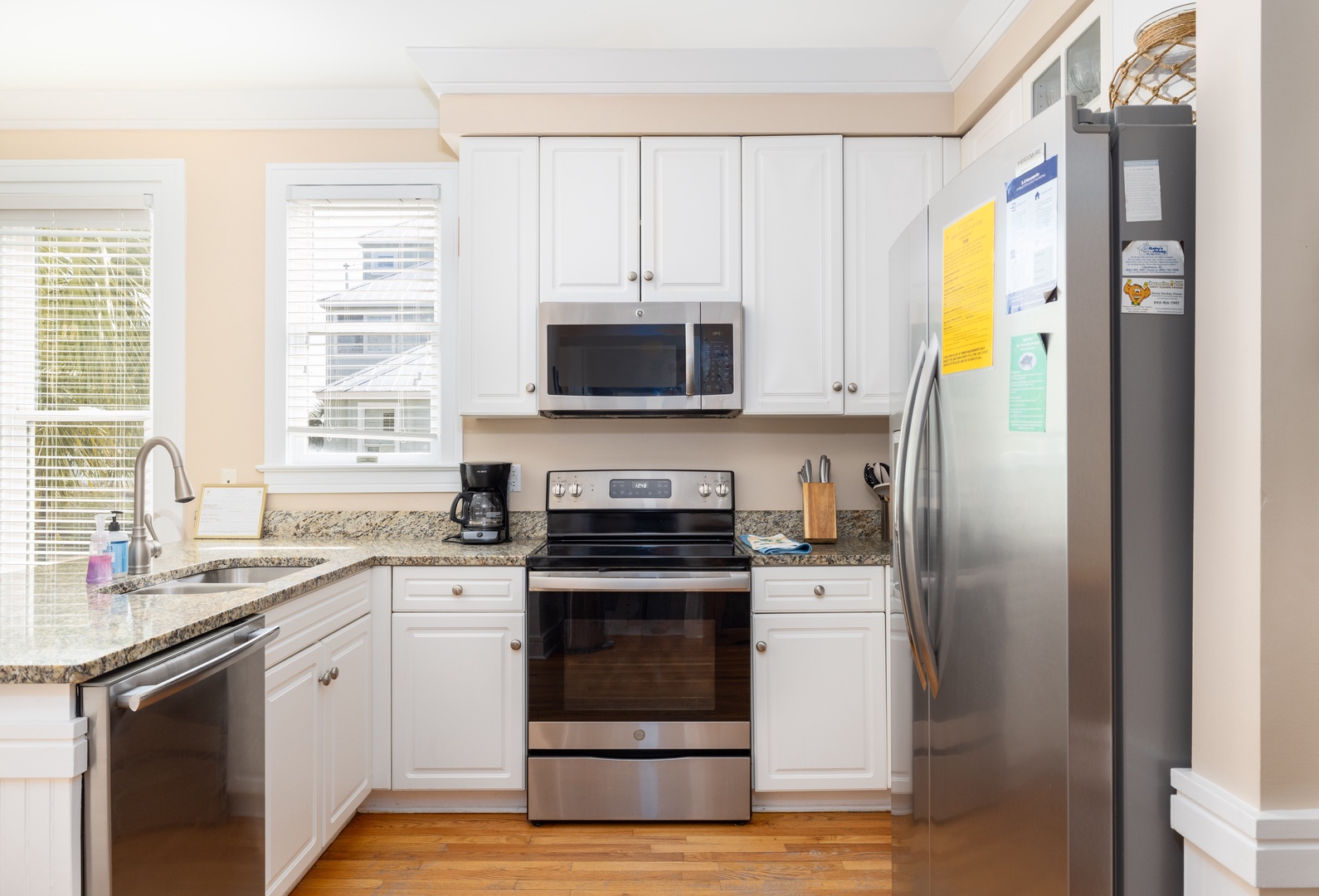 Granite countertops and stainless steel appliances.