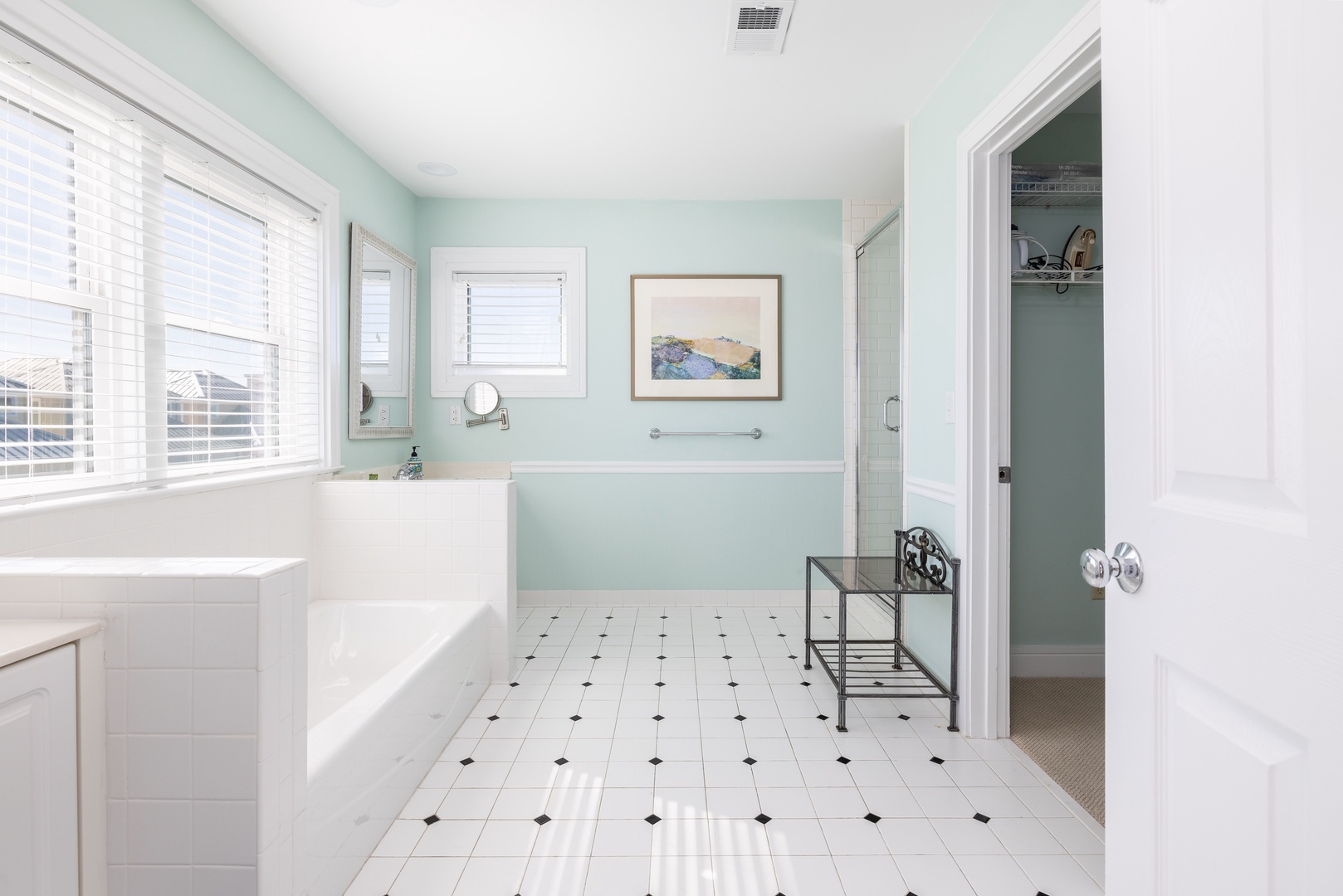 Modern bathrooms with a walk-in shower, soaking tub, and dual sinks in the master bathroom.