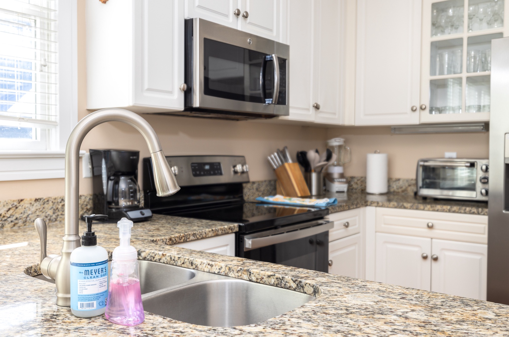 Fully equipped kitchen with modern appliances, including a refrigerator, oven, microwave, and dishwasher.
