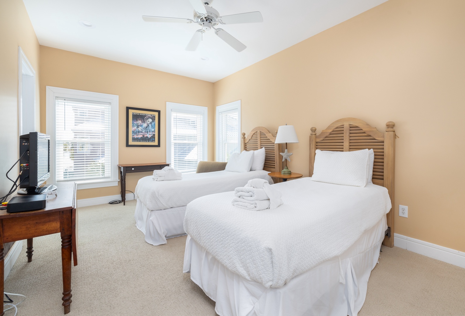 Additional bedrooms include a king-size bedroom with ocean views, a twin bedroom with two twin beds, and a spacious bedroom on the main floor with two queen beds.