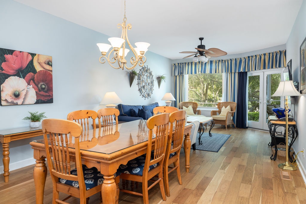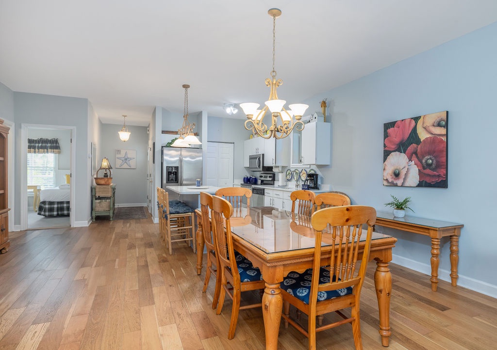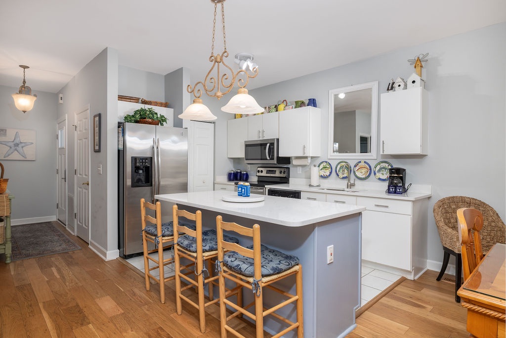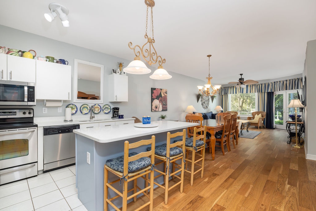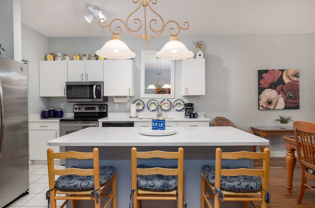 The fully equipped kitchen includes modern appliances, cookware, and all the essentials needed to prepare meals with ease. A cozy dining area seats four guests, making it the perfect place to share breakfast before exploring the island.