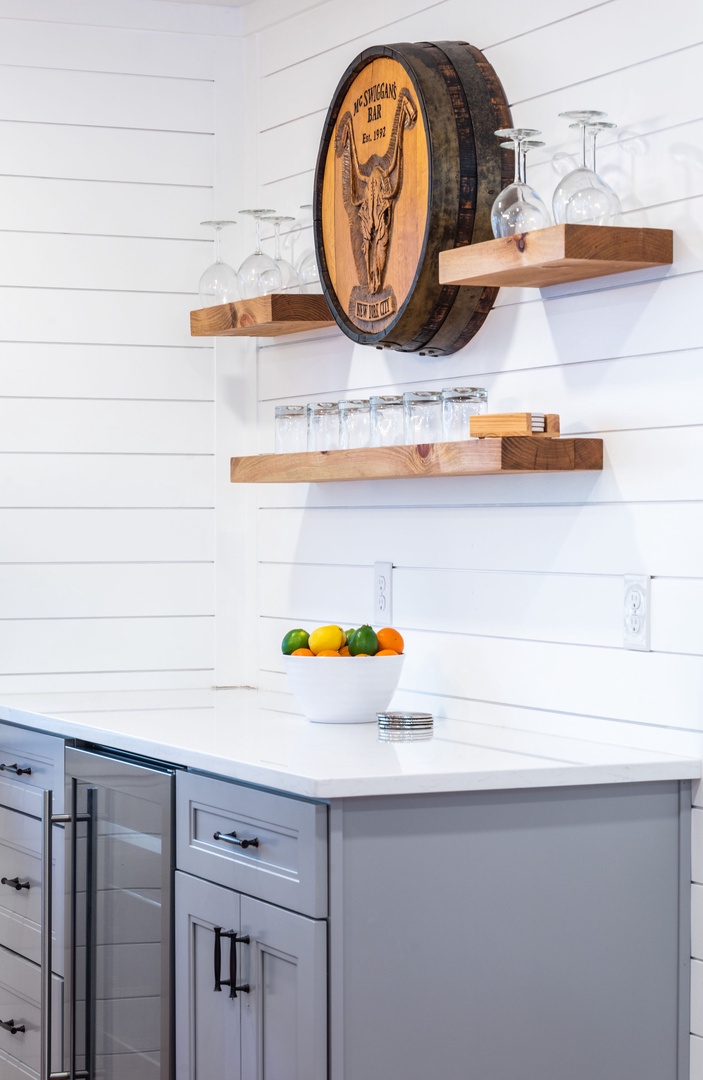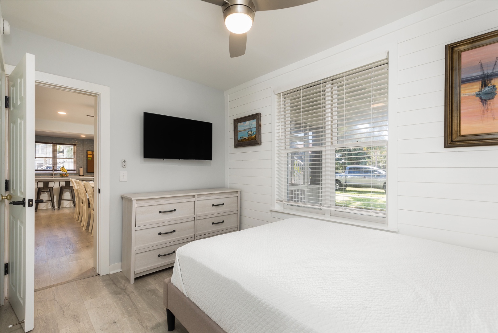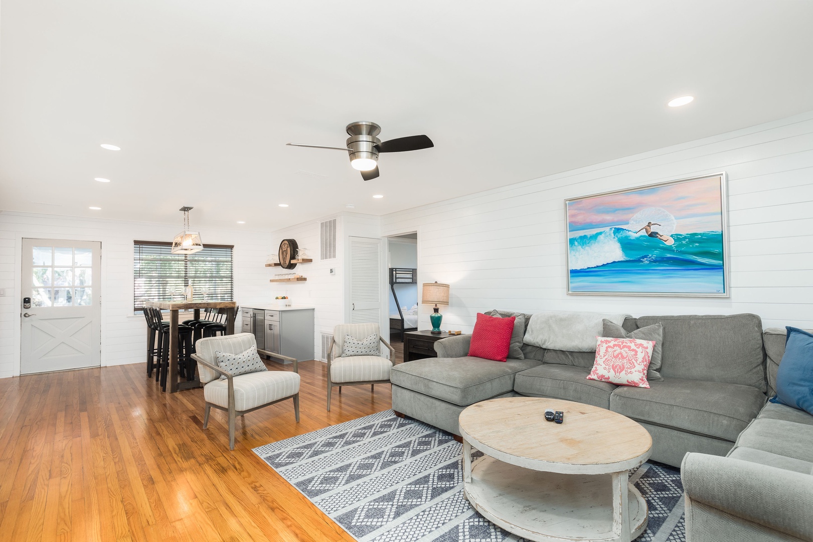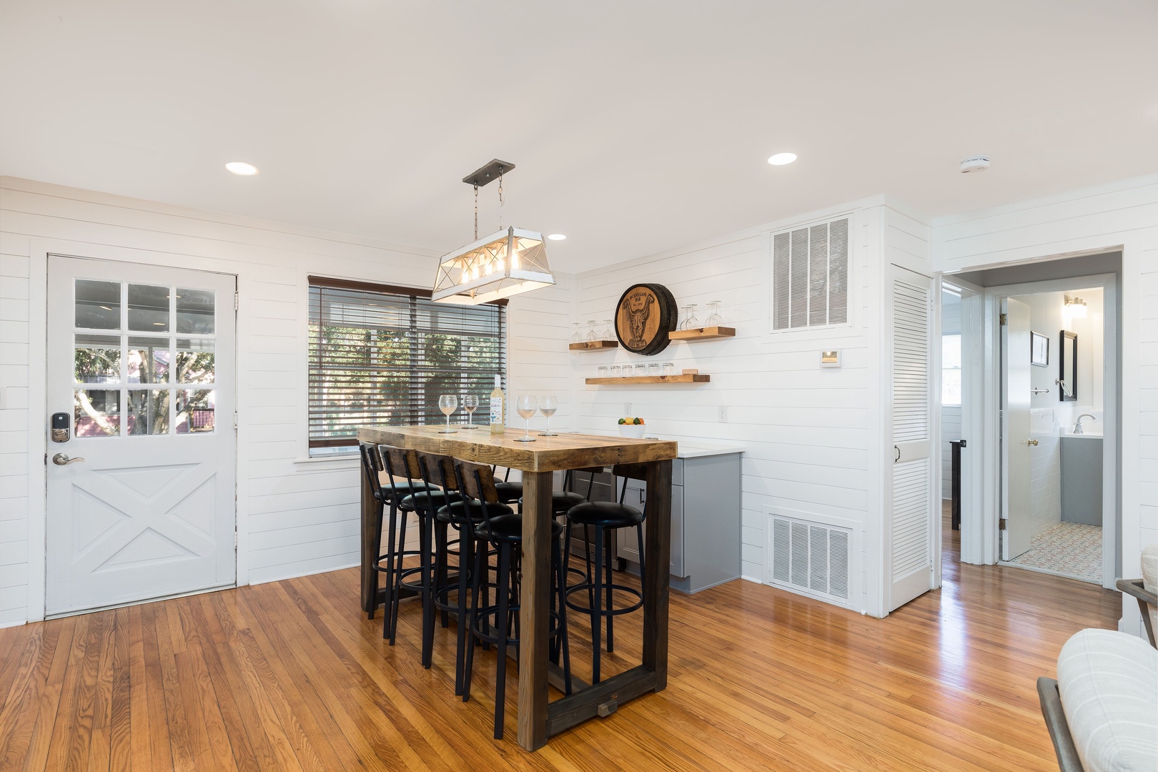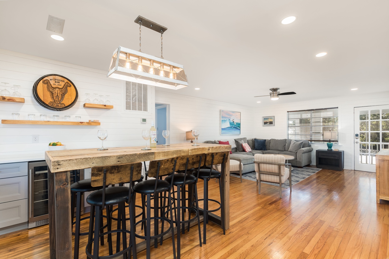 Living Area: Enter through the screened-in front porch to find a spacious kitchen with a dining table and TV for game days. The inviting living area on the second floor features a high-top table, dry bar, and comfortable seating.