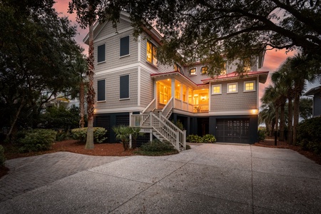 Breathtaking oceanfront home glowing at sunset, just steps from the pristine Isle of Palms beach