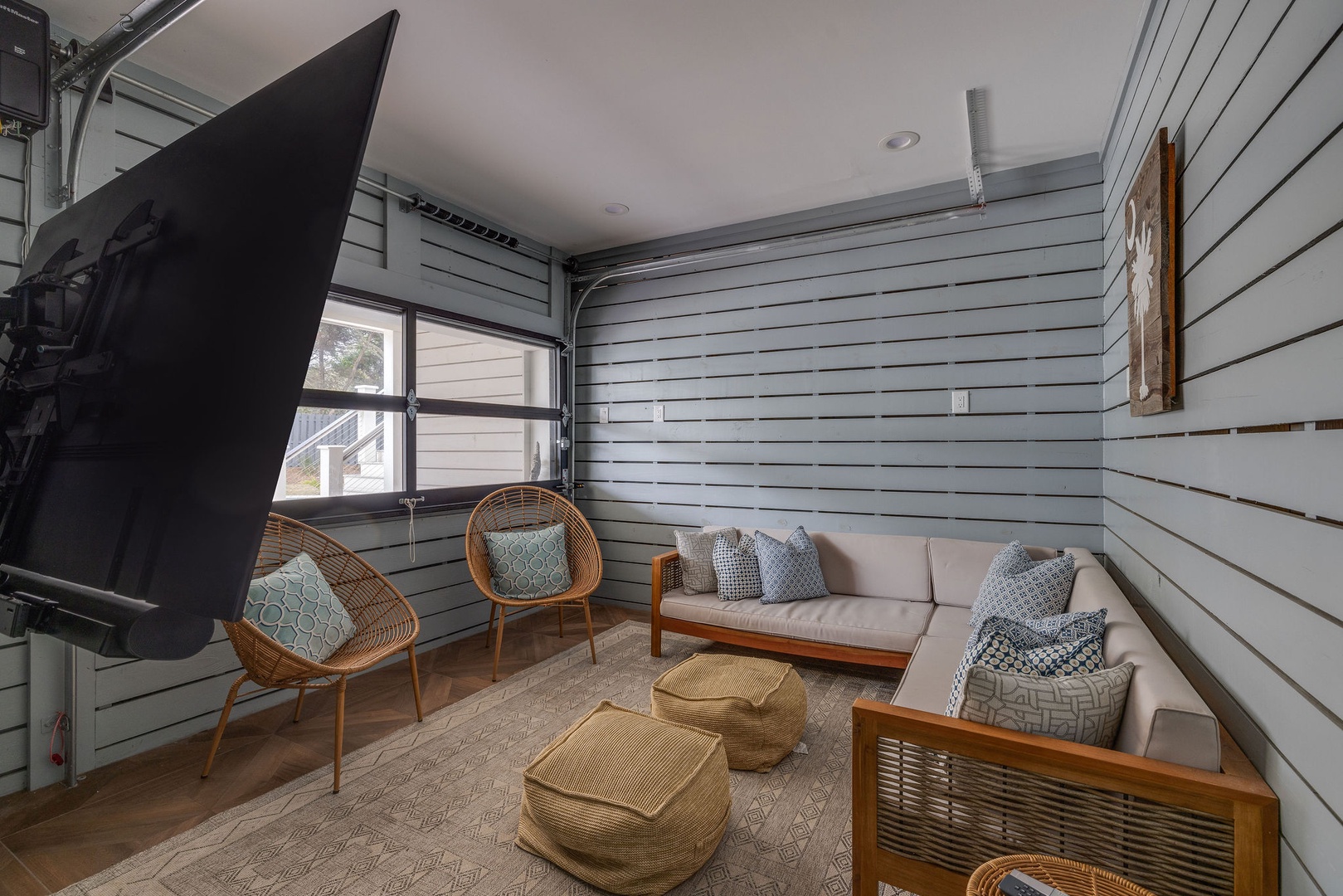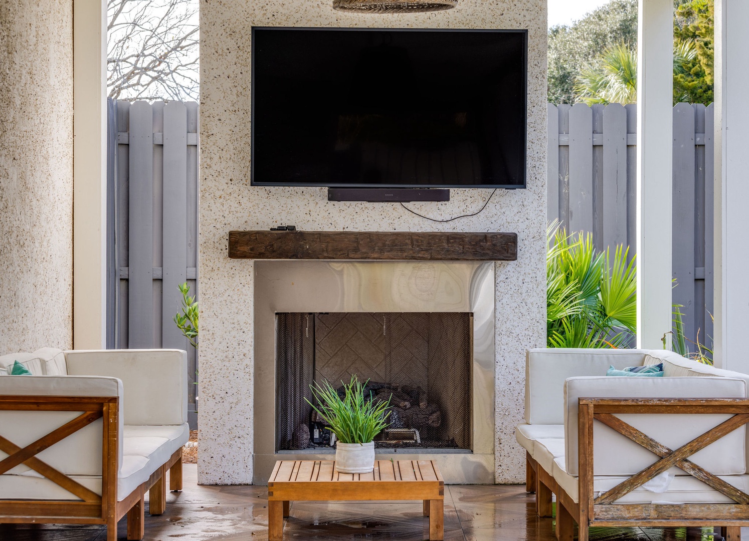 Inviting outdoor living area with two TVs, an outdoor fireplace, and ample seating.