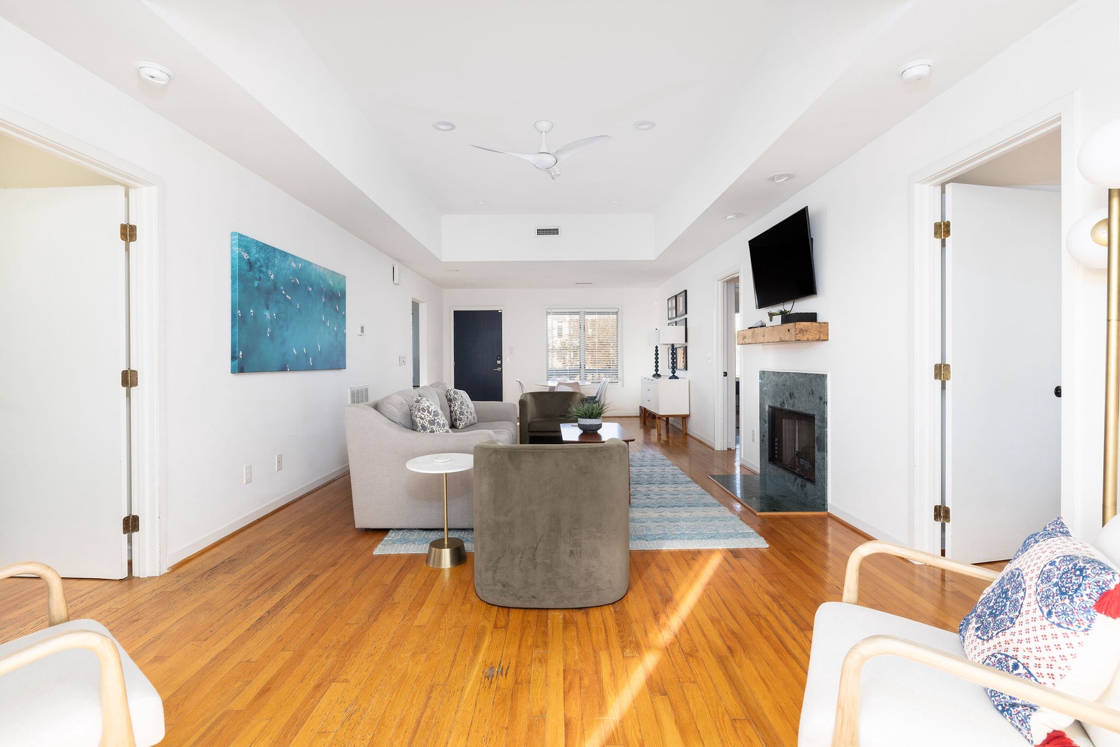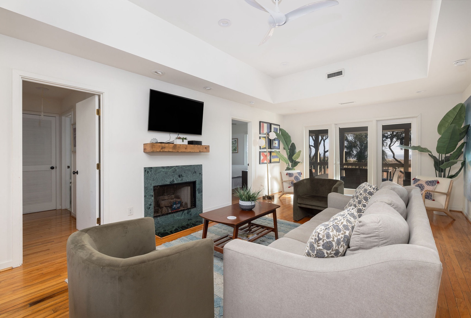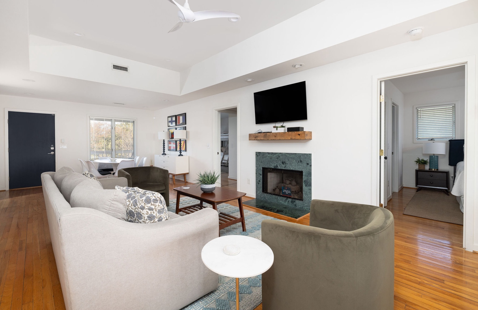 Spacious living room with a fireplace, flat-screen TV, and plenty of seating for relaxation.