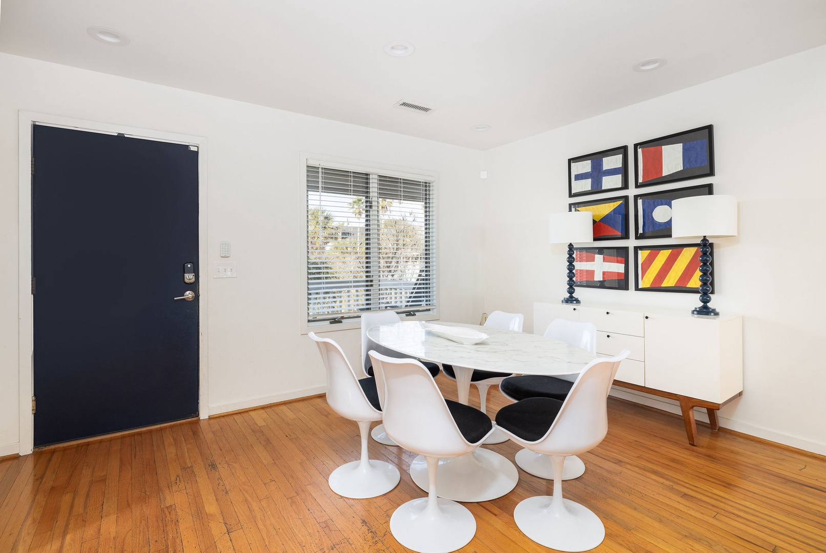Dining area with a marble dining table, ideal for family meals and game nights.