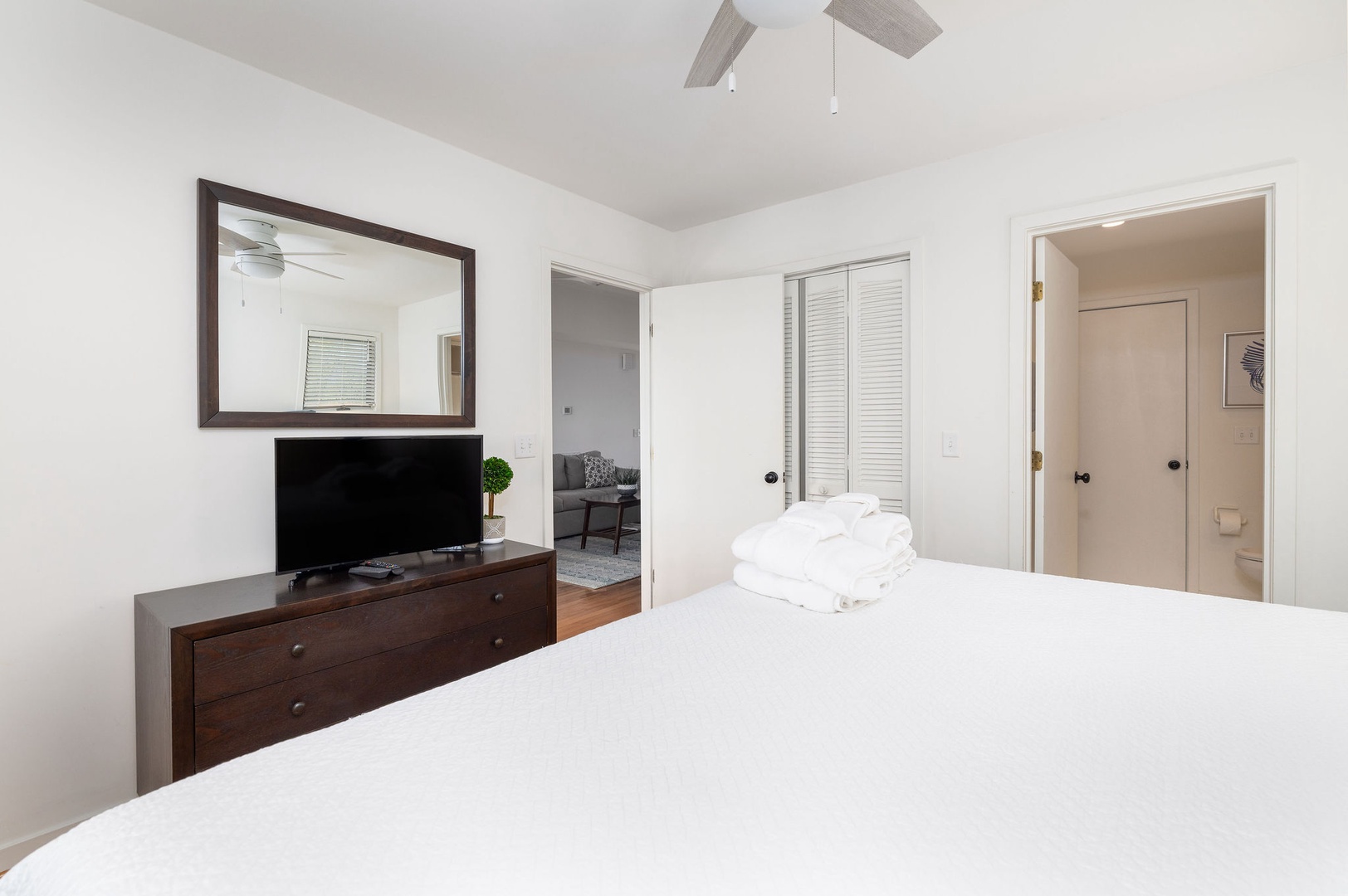 Bedroom 2: King bed with ocean views, flat-screen TV, and access to the Jack and Jill bathroom.
