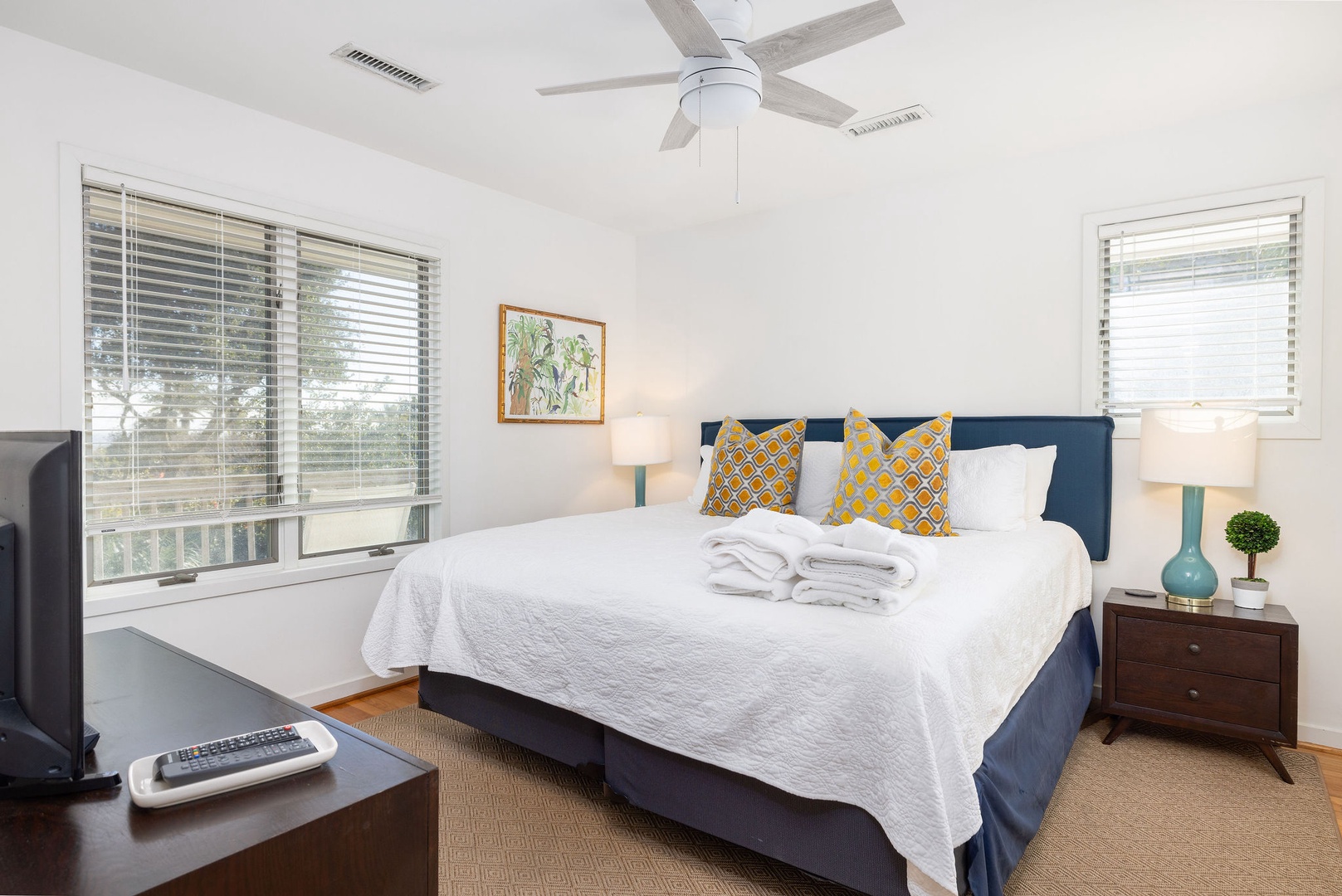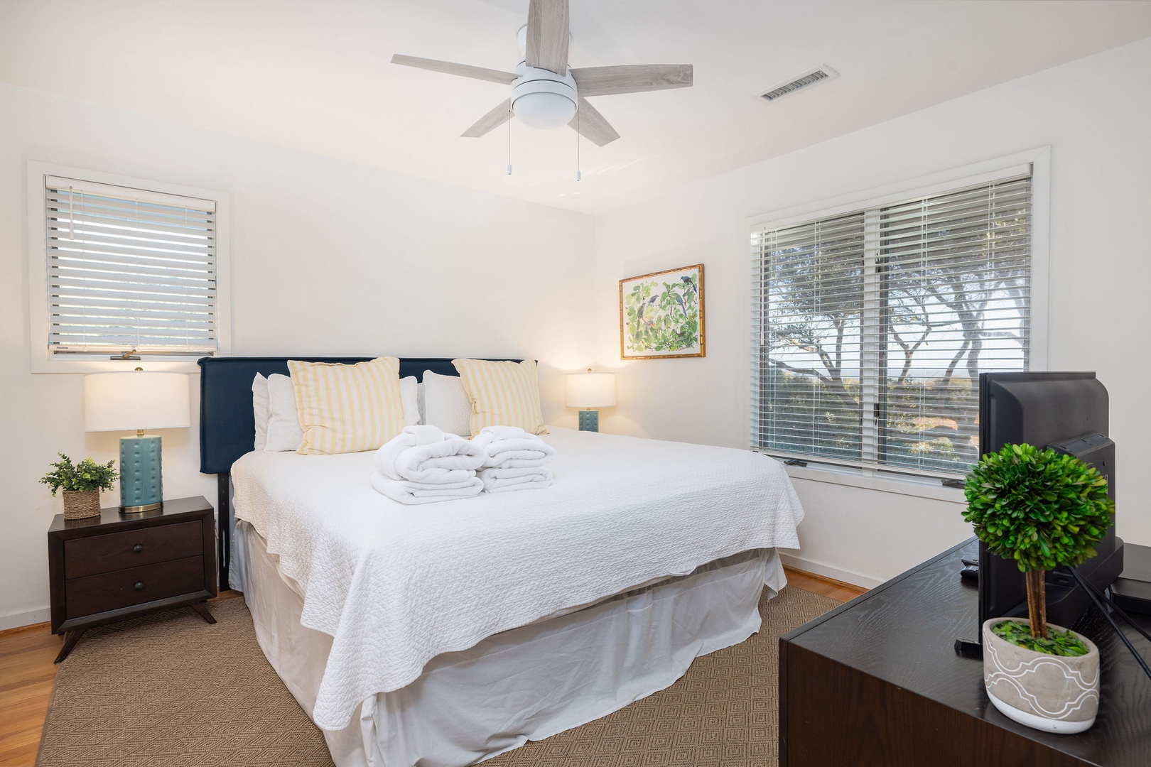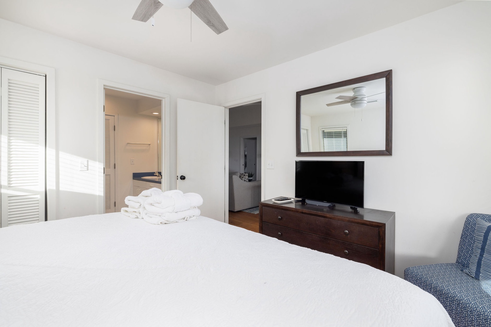 Master Bedroom: King bed with ocean views, flat-screen TV, and private en-suite bathroom.