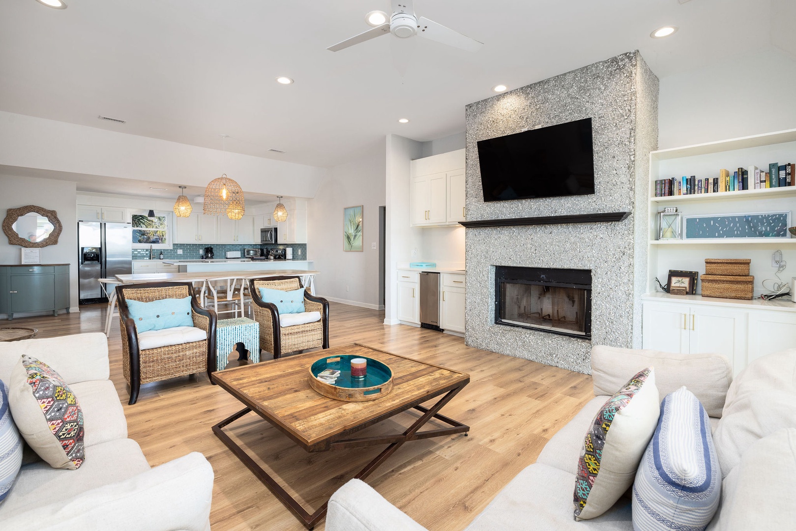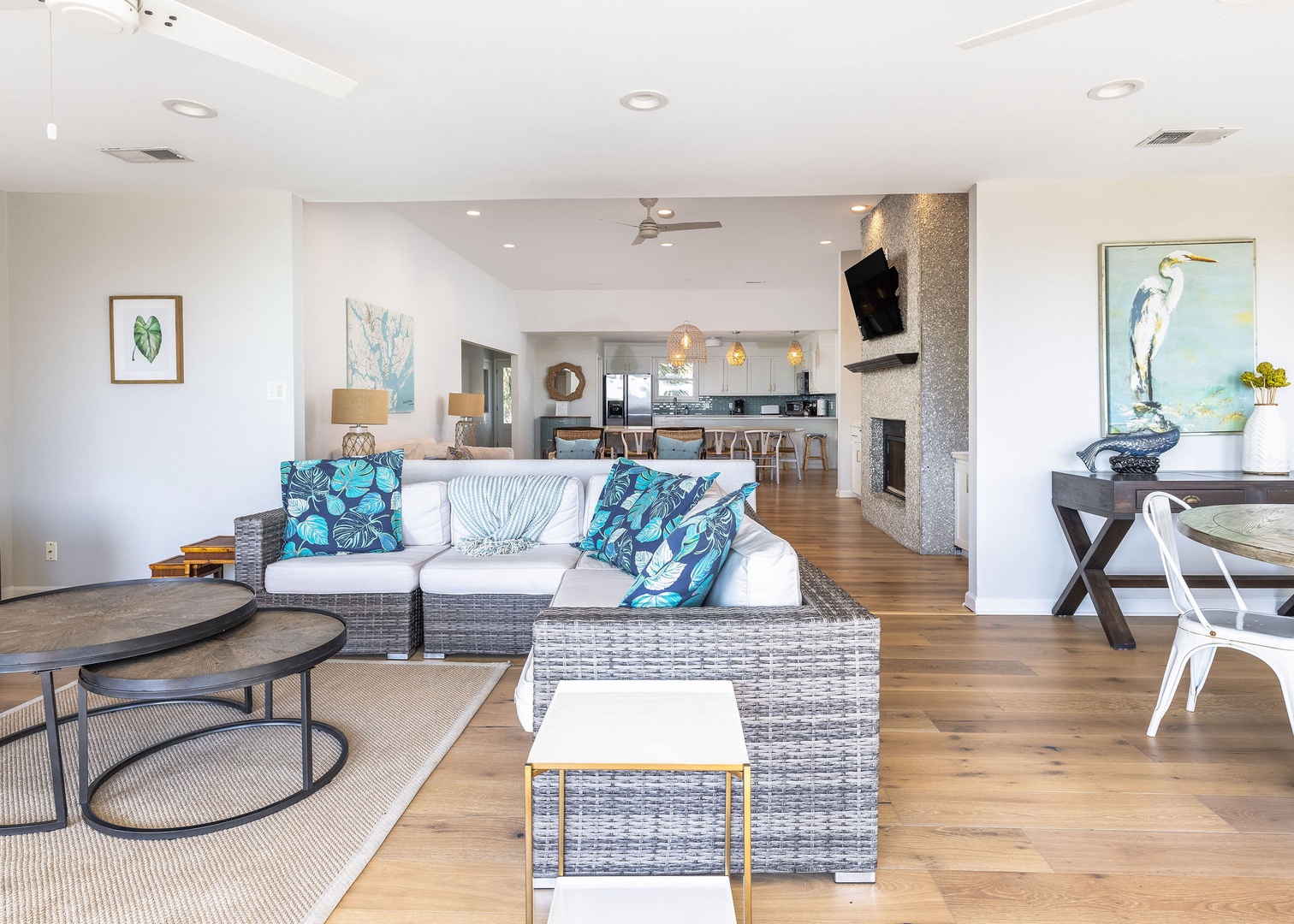 Recently renovated living room, sunroom, and kitchen with professional décor.