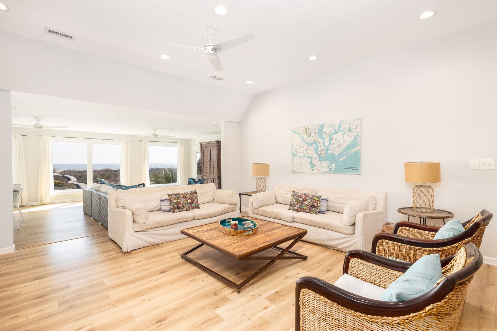 Spacious living room with comfortable furniture, flat-screen TV, and ocean views.