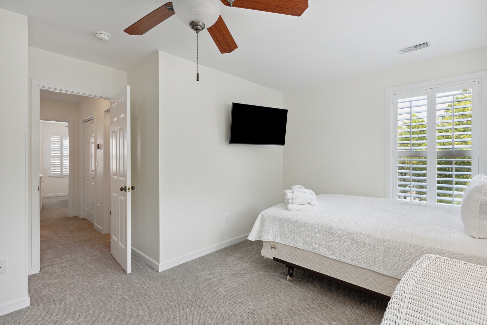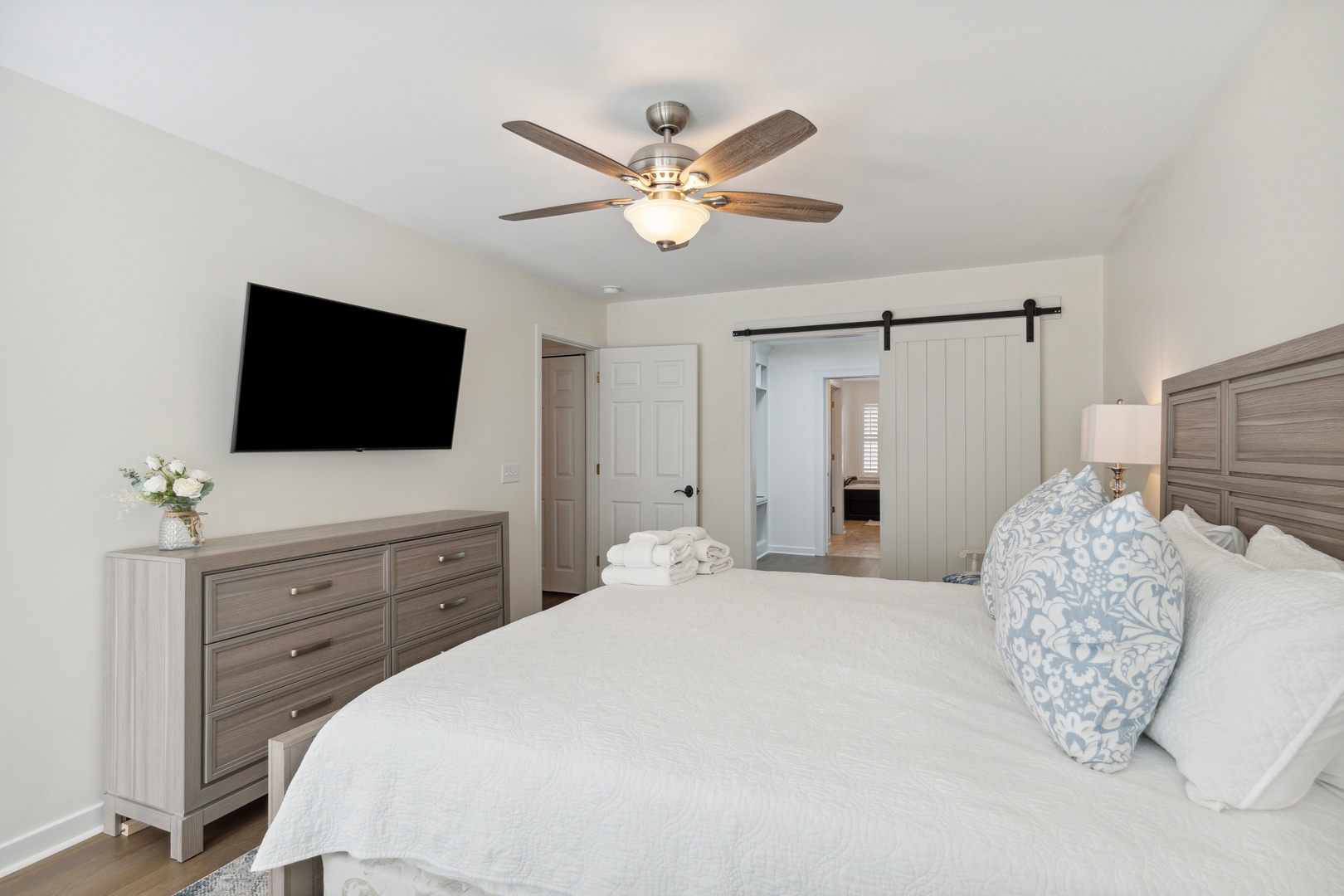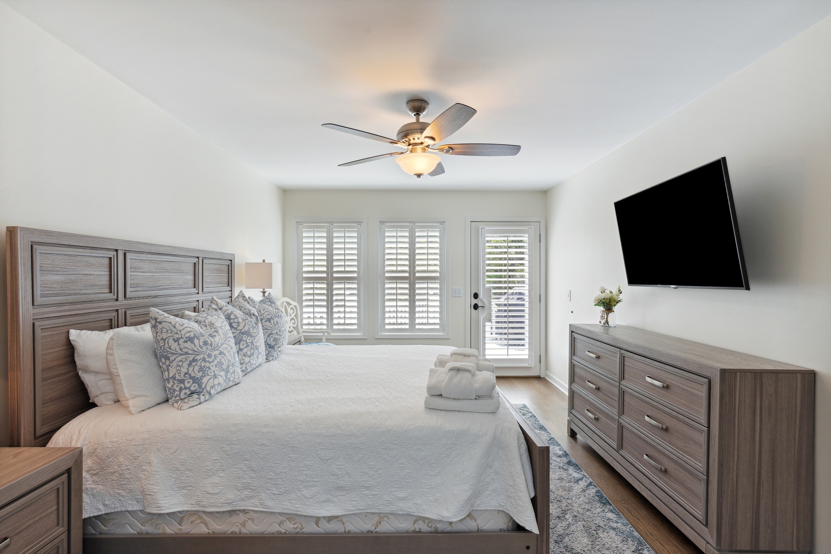 Each bedroom is designed with ample closet space and mounted flat-screen TVs, ensuring comfort and convenience for all guests.