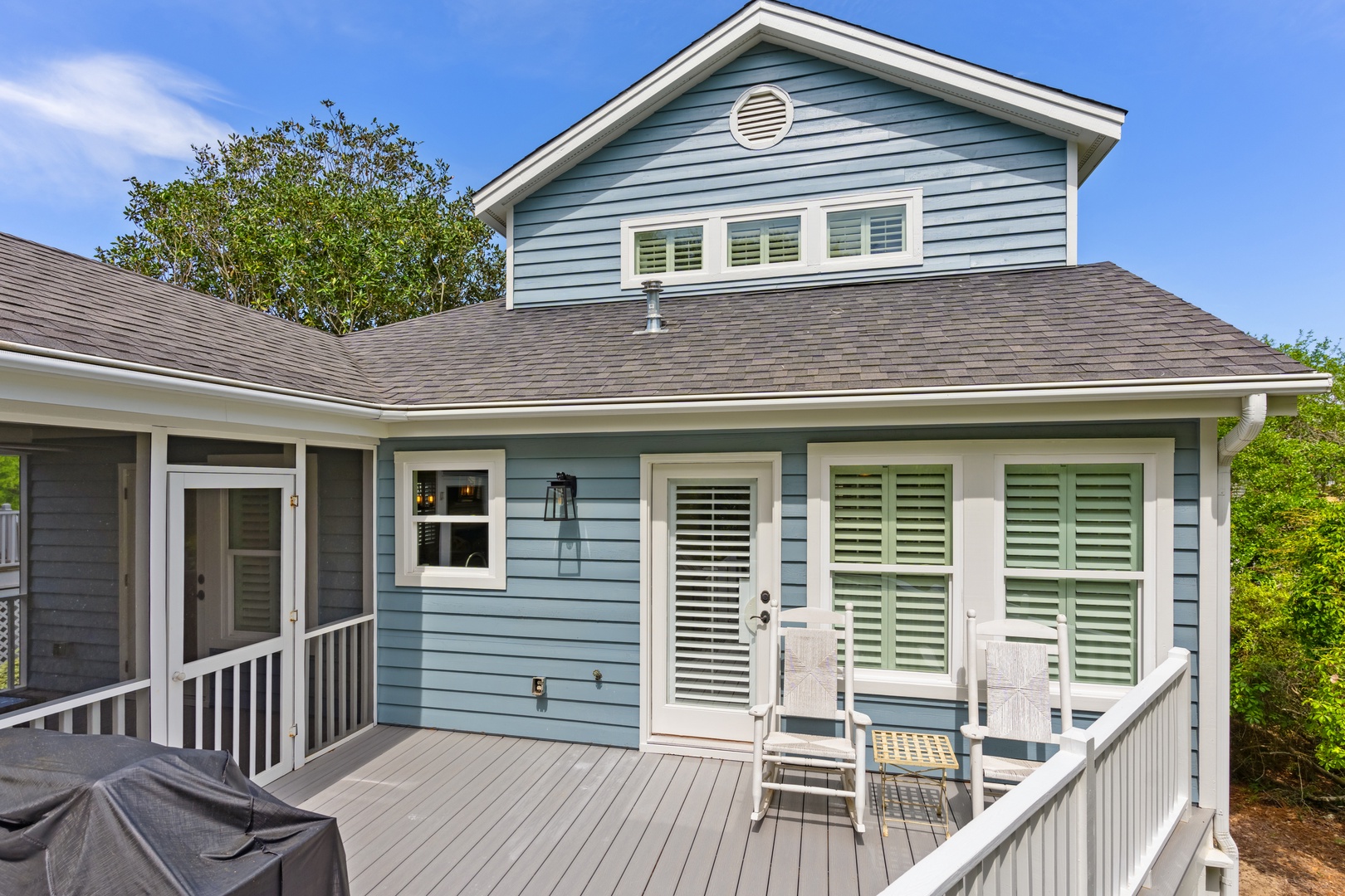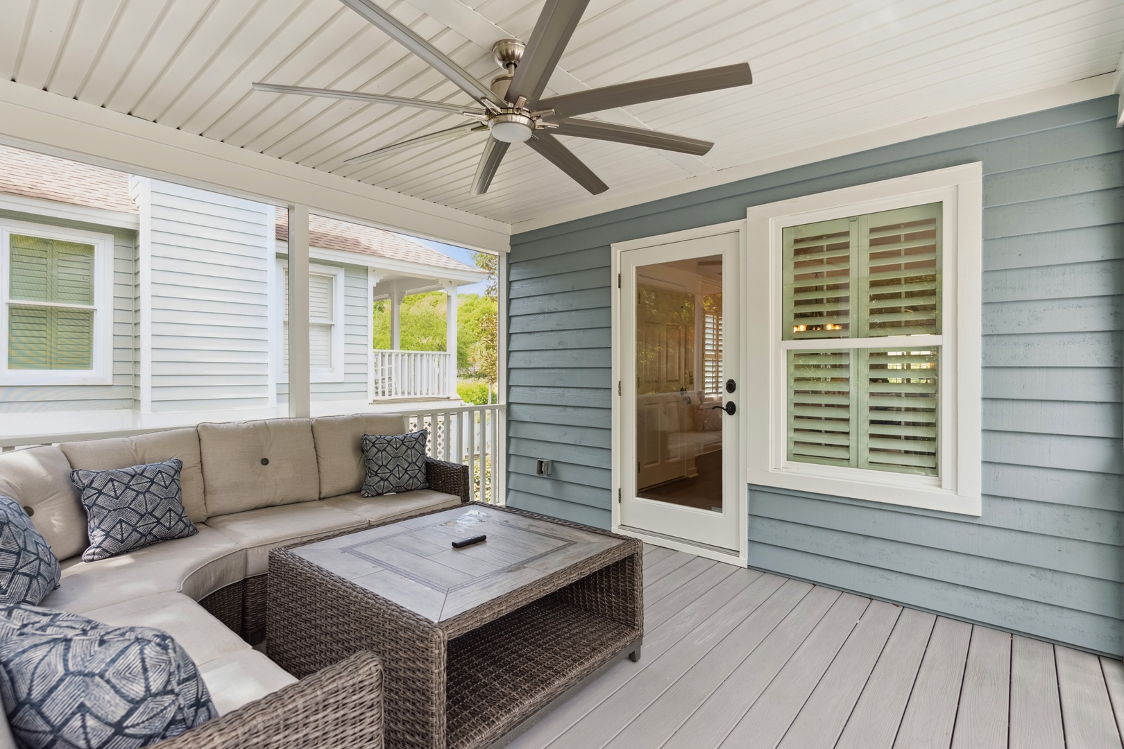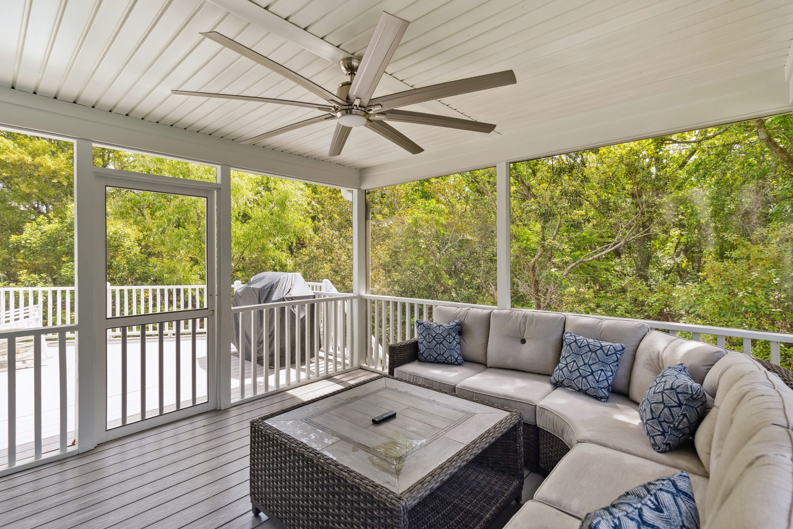 Deja Bleau offers an outdoor deck perfect for grilling, where you can also enjoy relaxing on the screened-in porch, which features a cozy couch for lounging. The property is just a short walk to the private Pelican Bay pool and directly across the street from beach access, making it an ideal spot for both outdoor enjoyment and easy beach outings.