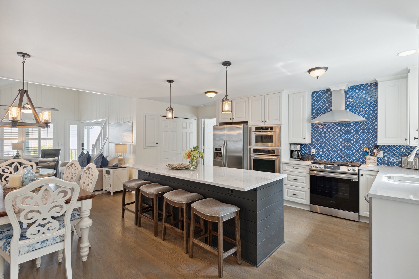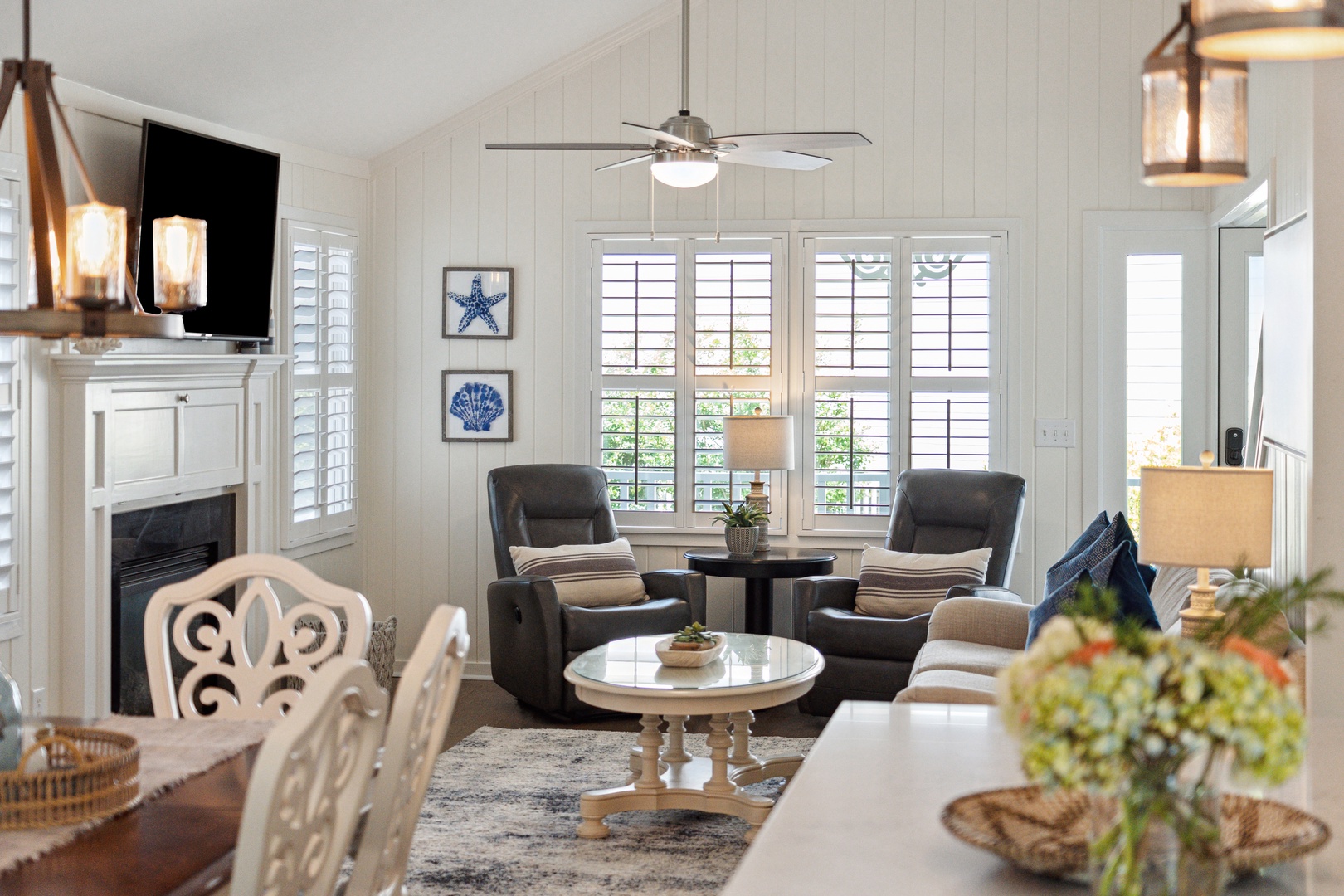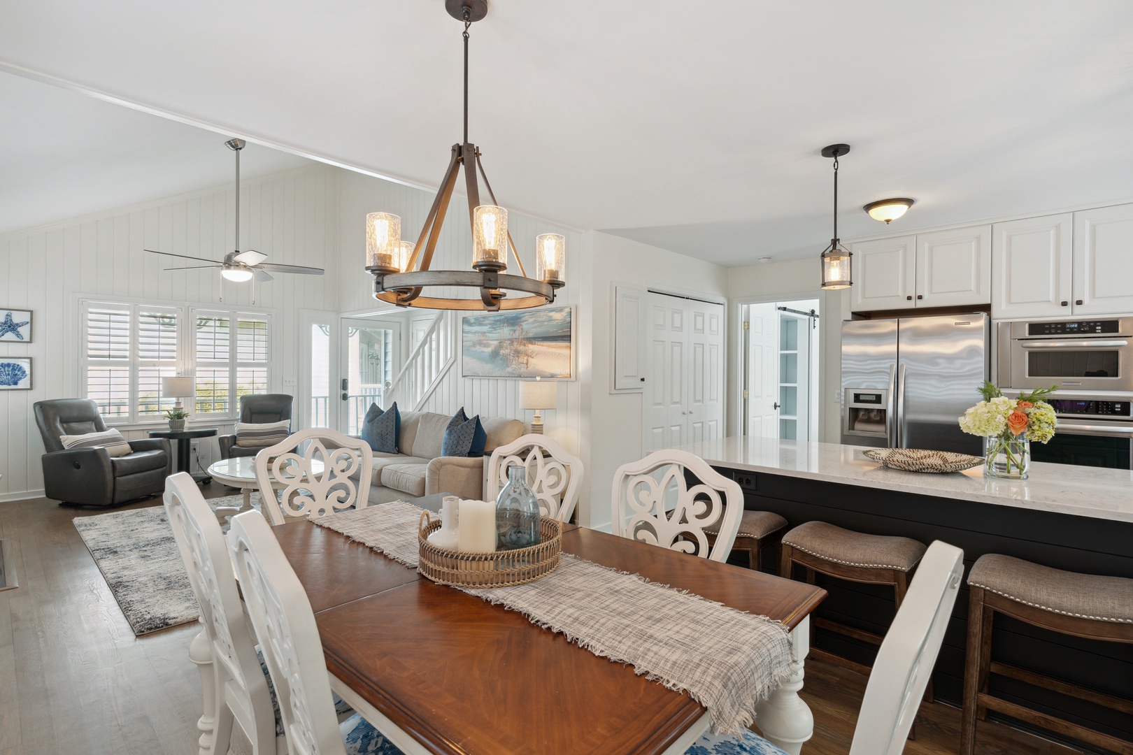 Spacious and comfortable living room with ample seating and a mounted flat-screen TV. The dining room is conveniently situated right next to the living area, enhancing the open-concept layout that seamlessly connects the living, dining, and kitchen spaces.