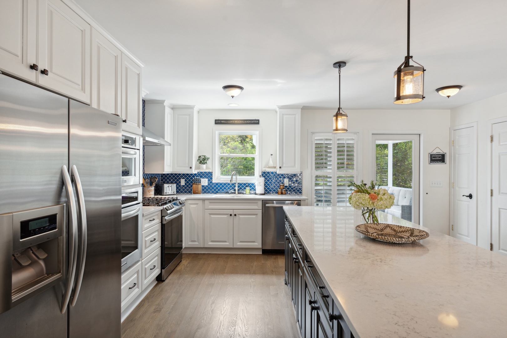 The kitchen at Deja Bleau features stainless steel appliances including a refrigerator, oven, microwave, and dishwasher. The expansive island serves as the heart of the kitchen, offering ample space for meal preparation, cocktail mixing, or casual dining. With its sleek granite countertops and modern fixtures, this kitchen not only provides functionality but also invites socializing and culinary creativity. Whether you're cooking a family meal or entertaining guests, the well-designed kitchen ensures a delightful experience.