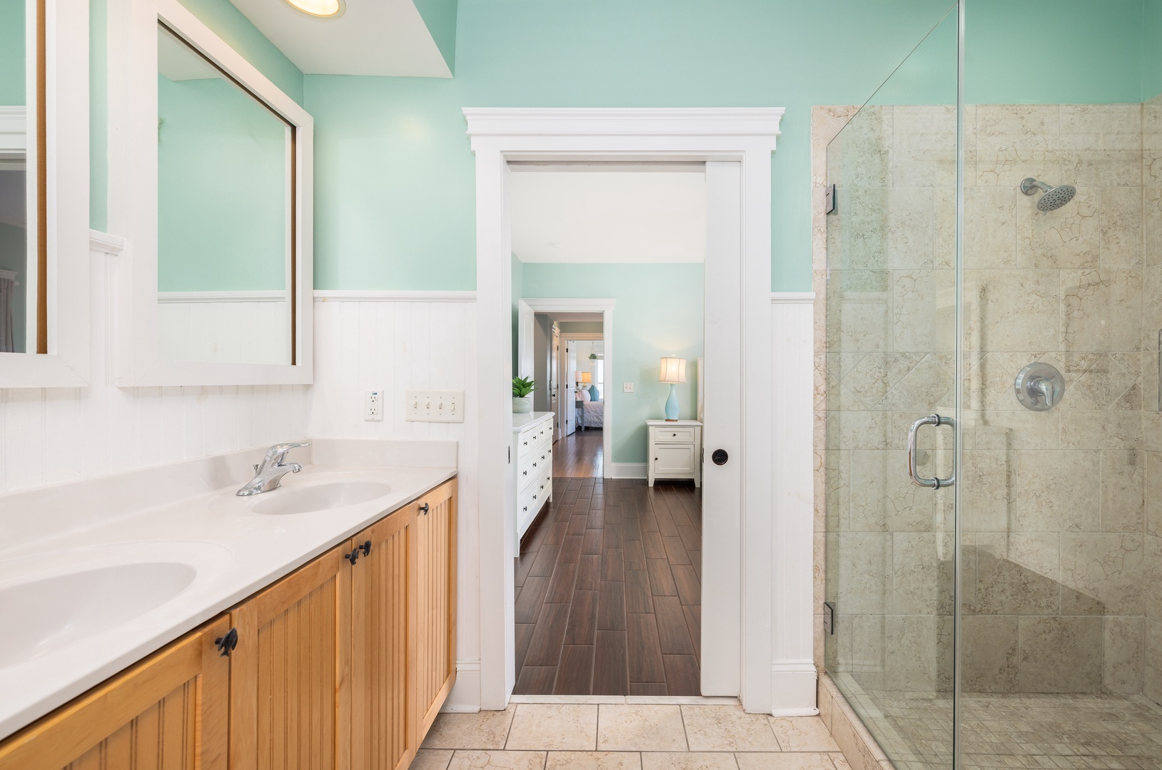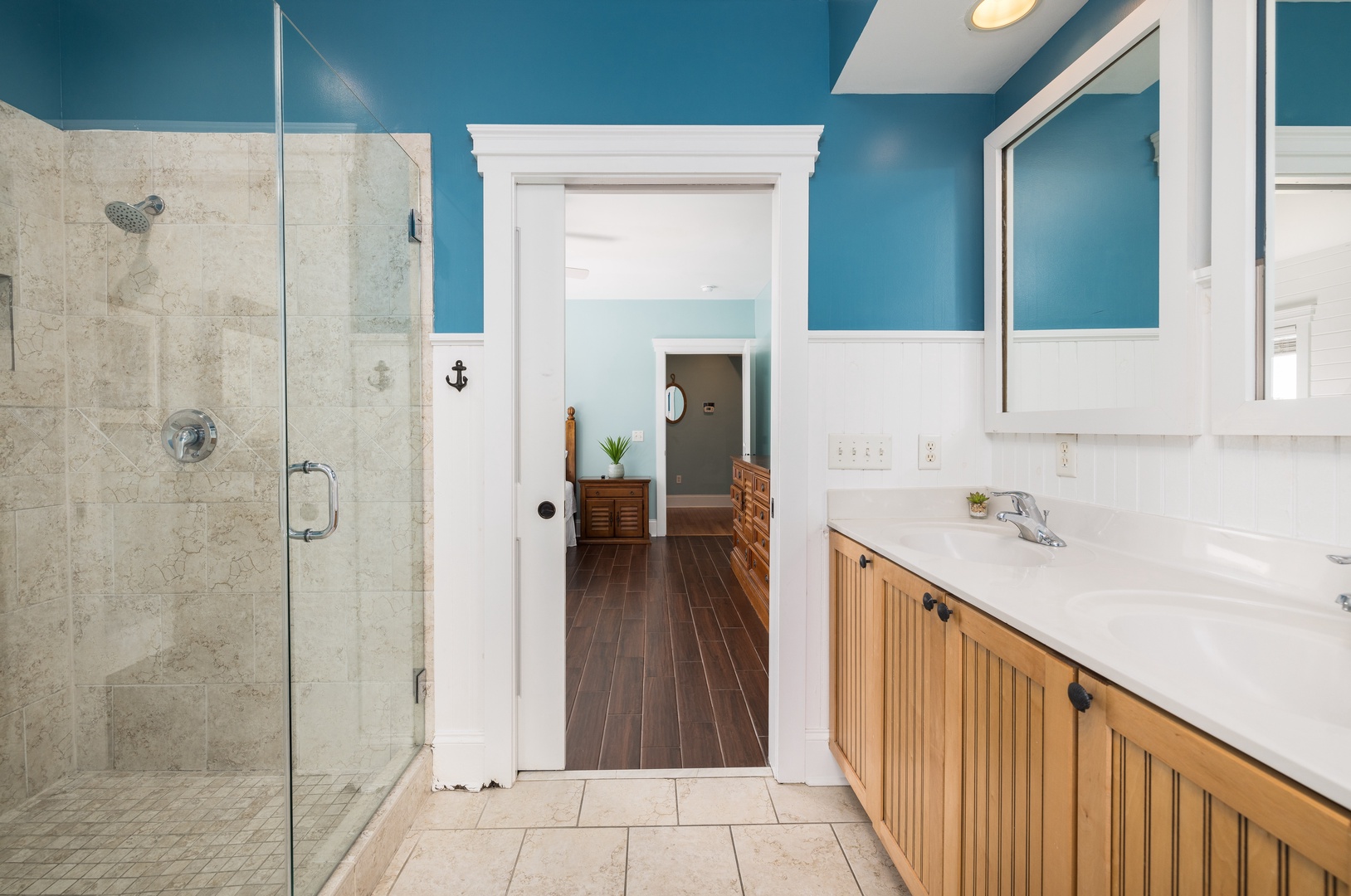 Master Suite: Features a private balcony entrance, an expansive bathroom with a walk-in shower and multiple shower heads, providing a relaxing experience.
