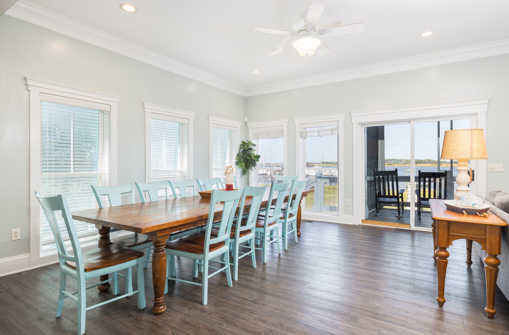 Screened porch dining area offers comfort, shade, and spectacular Lowcountry sunsets.