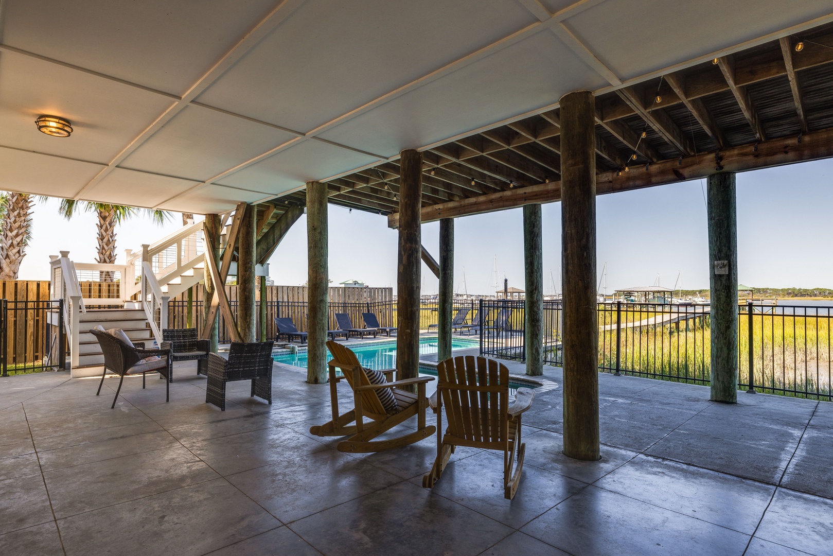 Garage & Pool Area: The open-air, two-car garage provides convenient parking. Adjacent is the pool area with river views, an outdoor bar, Adirondack chairs, and access to a private boat dock.