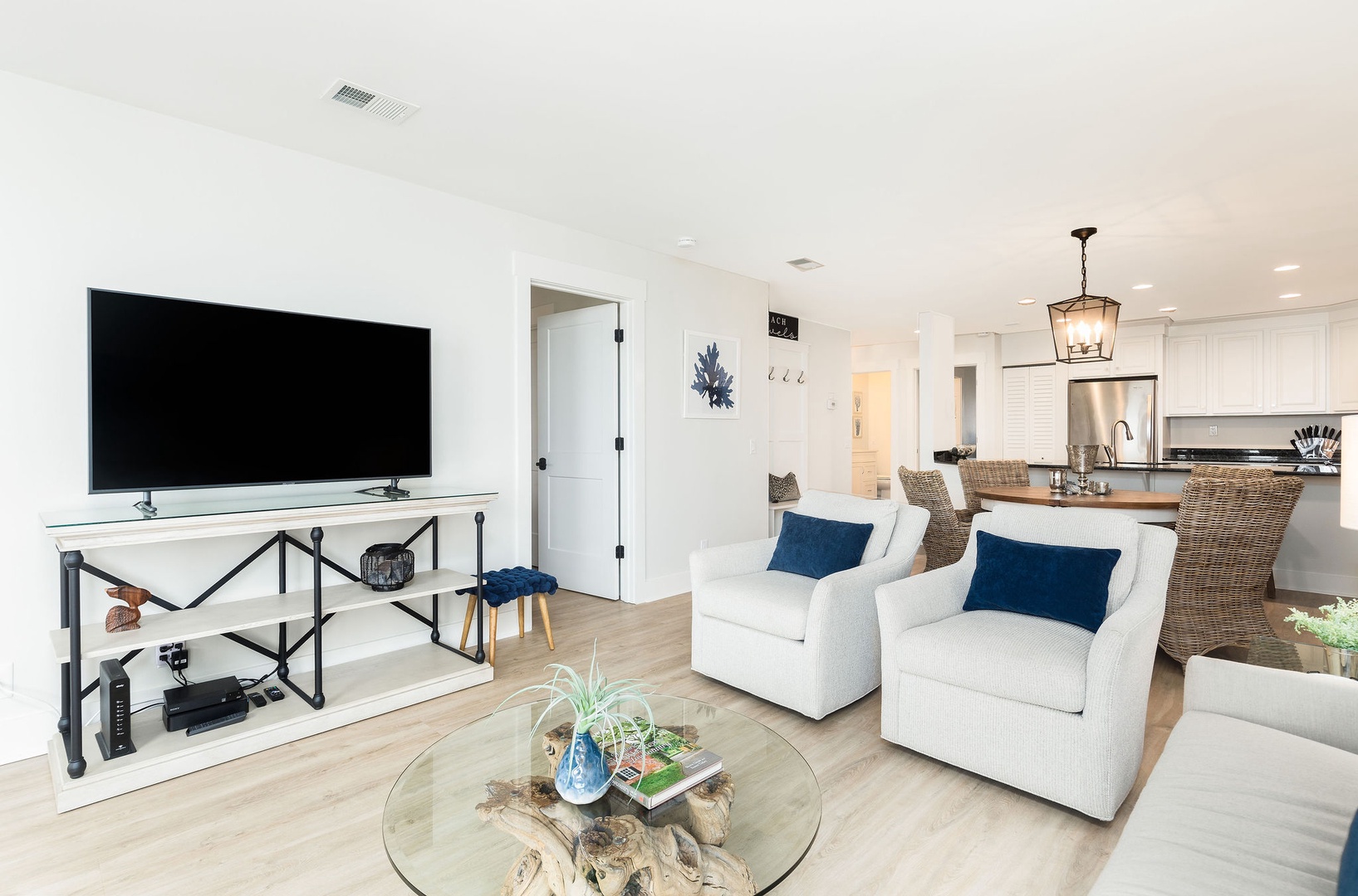 Spacious living room with comfortable seating and a large flat-screen TV.