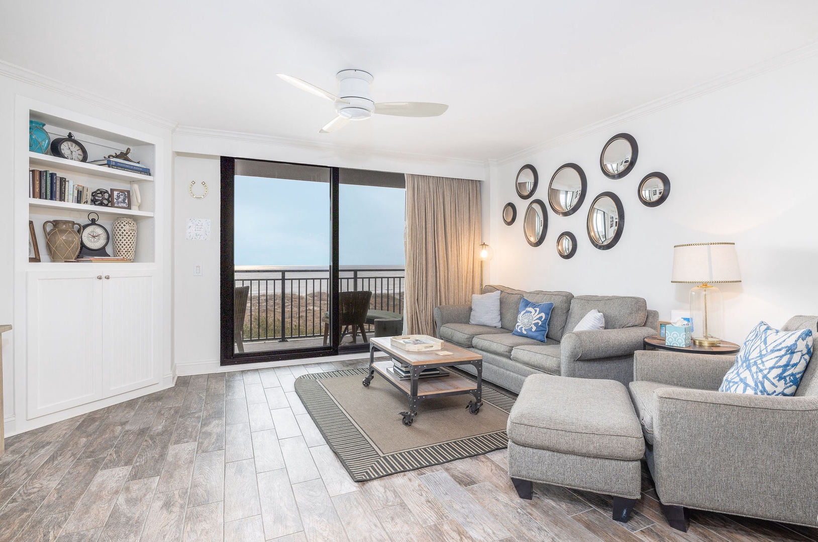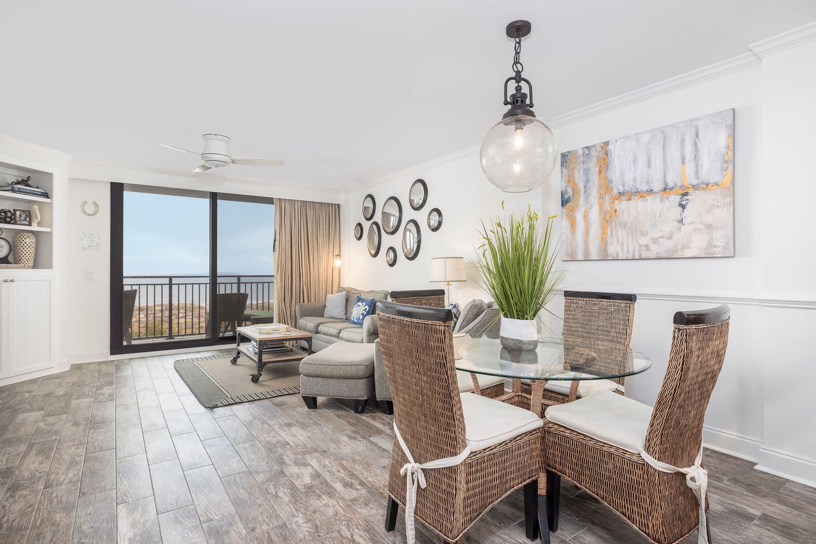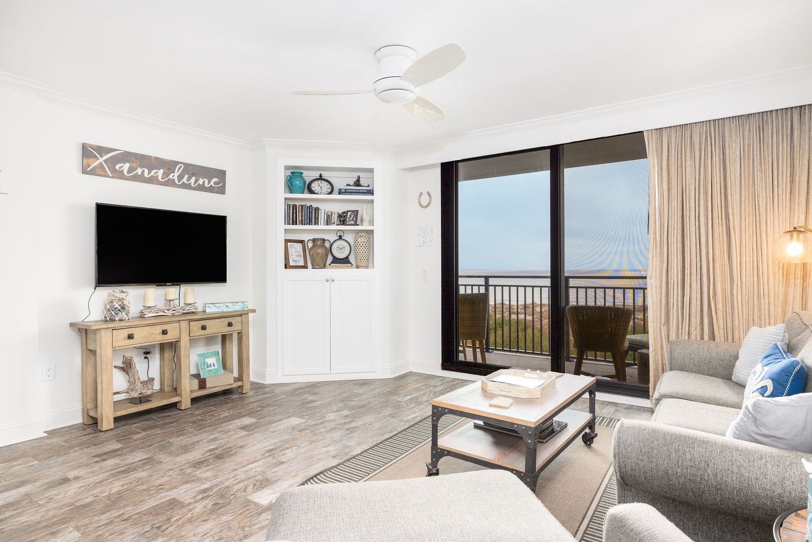 Spacious living room with a sleeper sofa, flat-screen TV, and panoramic ocean views. Sliding glass doors leading to the balcony, perfect for enjoying the salty ocean breeze. Open-concept design connecting the living and dining areas for seamless entertaining.