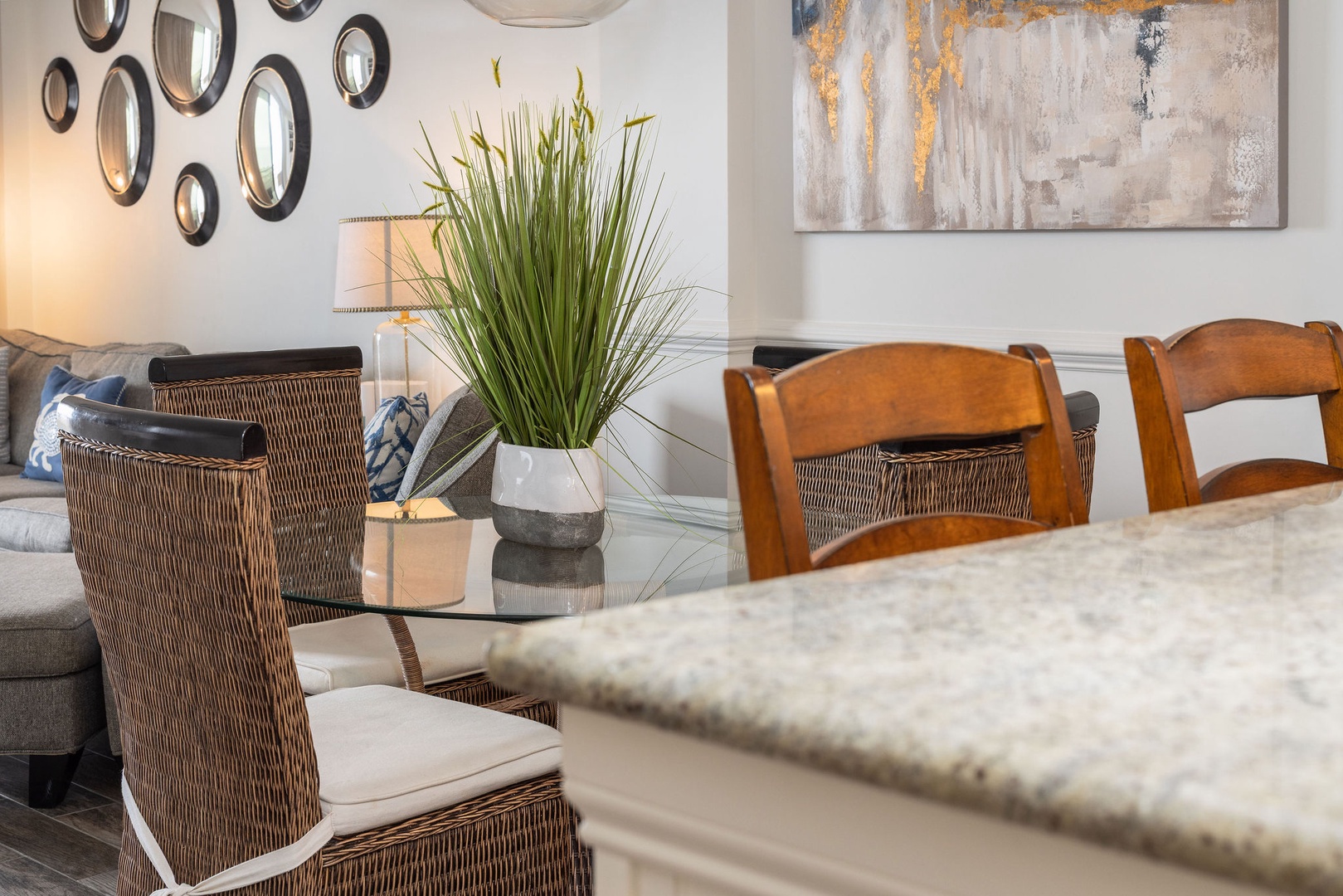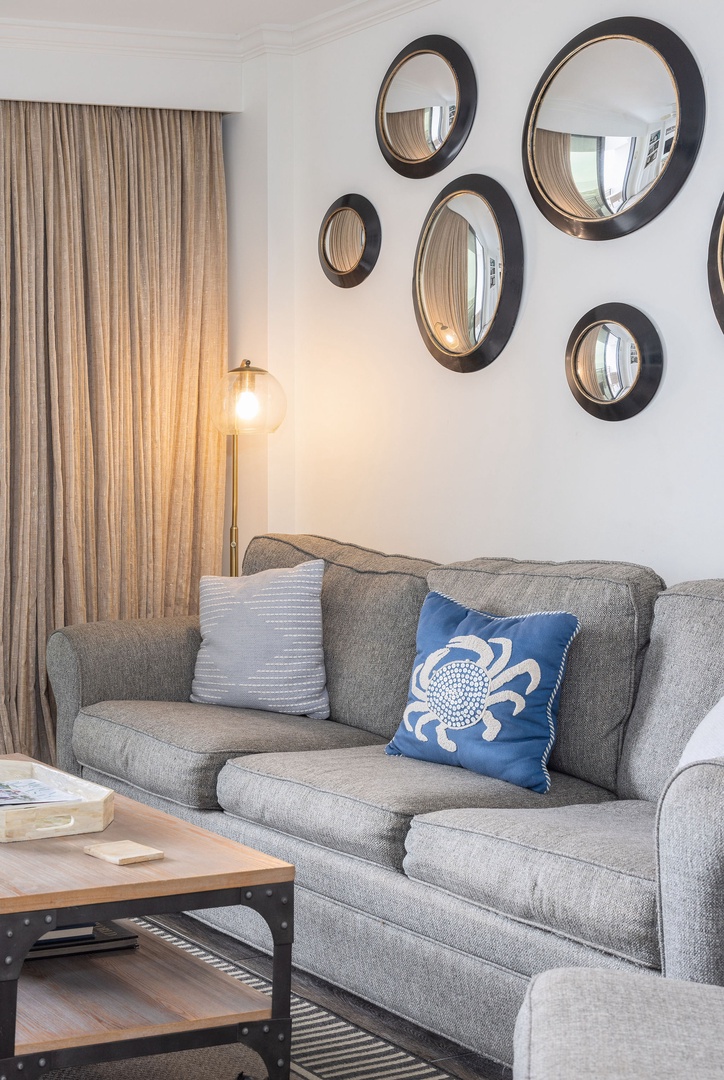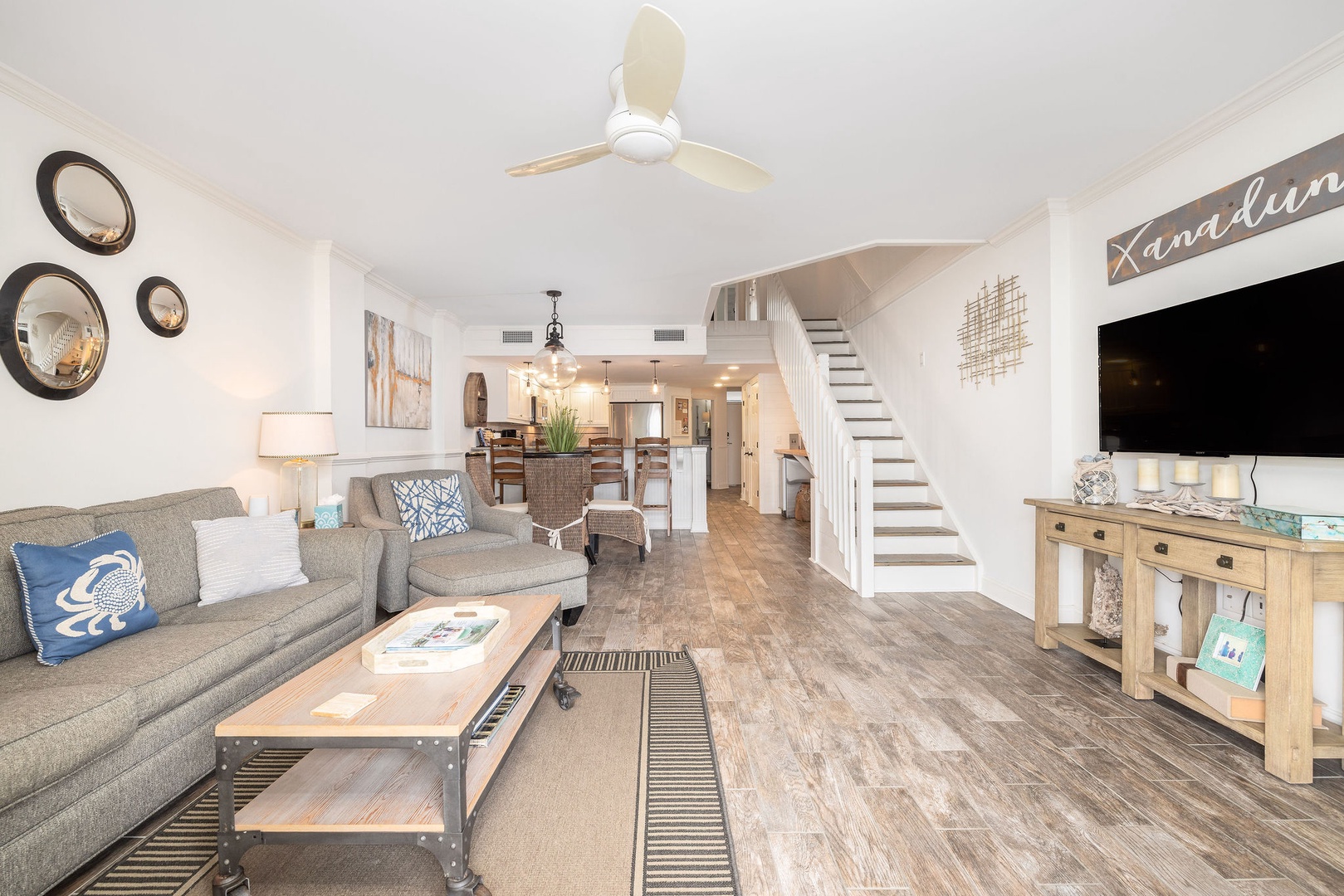 Spacious living room with a sleeper sofa, flat-screen TV, and panoramic ocean views. Sliding glass doors leading to the balcony, perfect for enjoying the salty ocean breeze. Open-concept design connecting the living and dining areas for seamless entertaining.