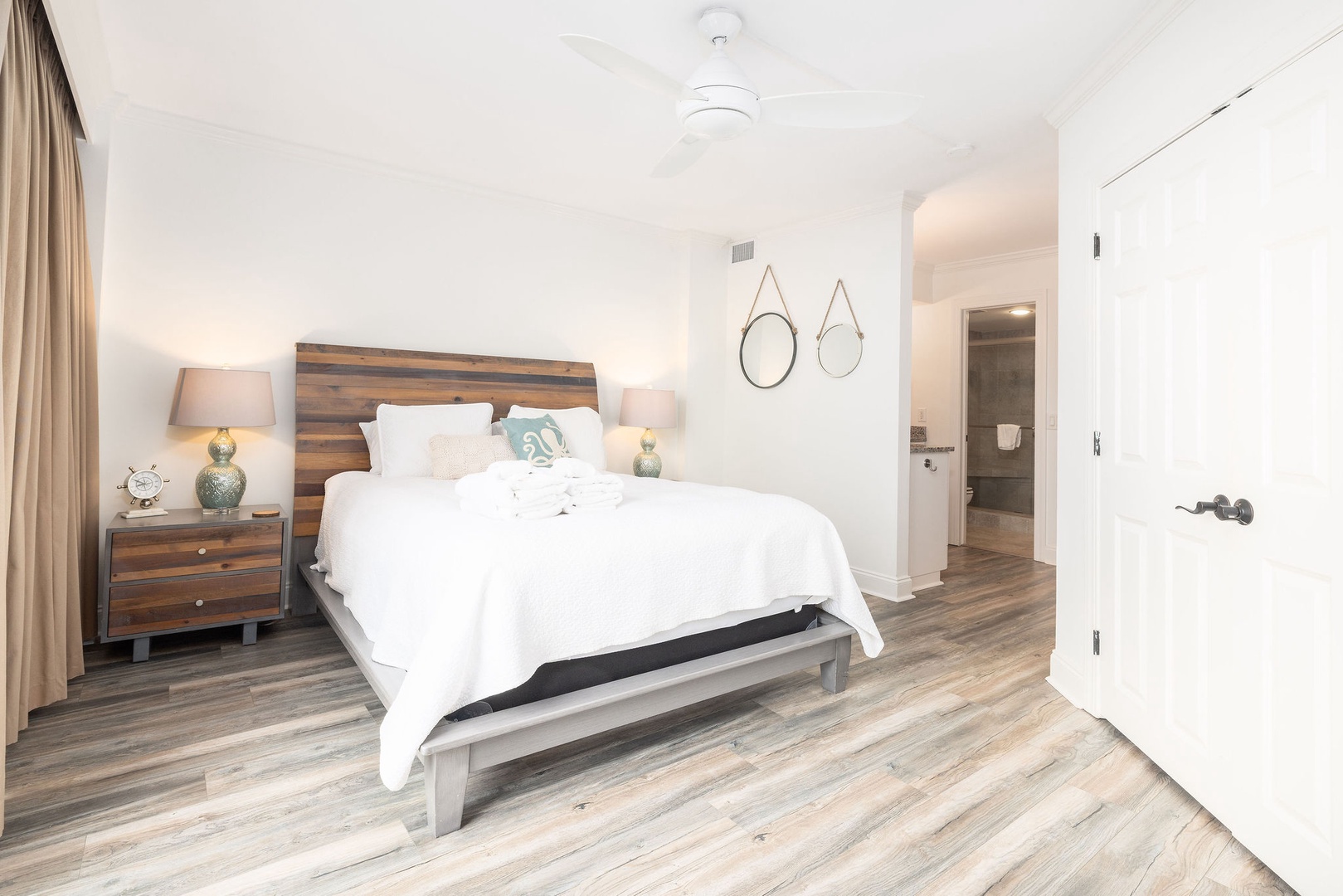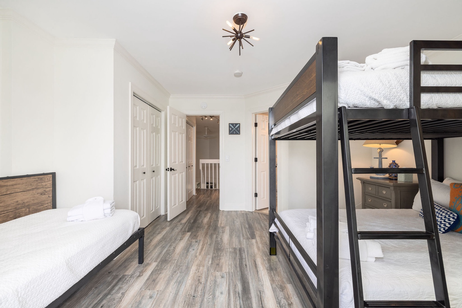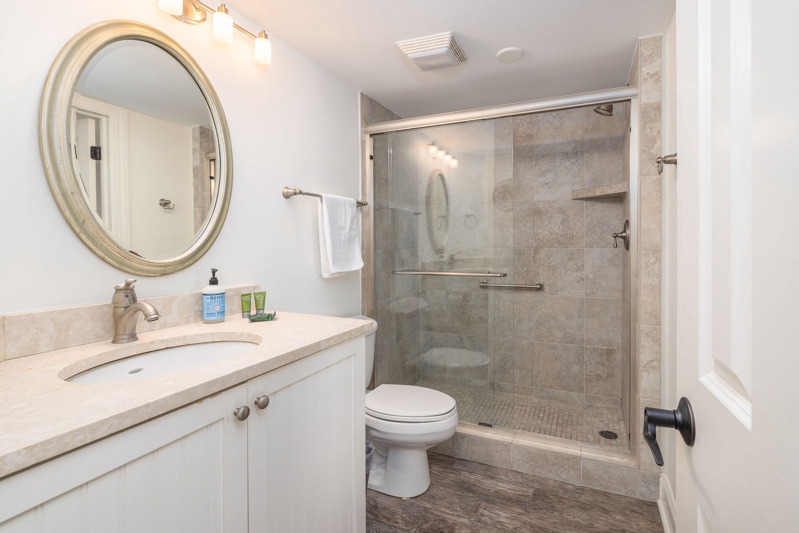 Bedroom 1 (Main Level): Queen bed with an en-suite full bathroom shared with the hallway.