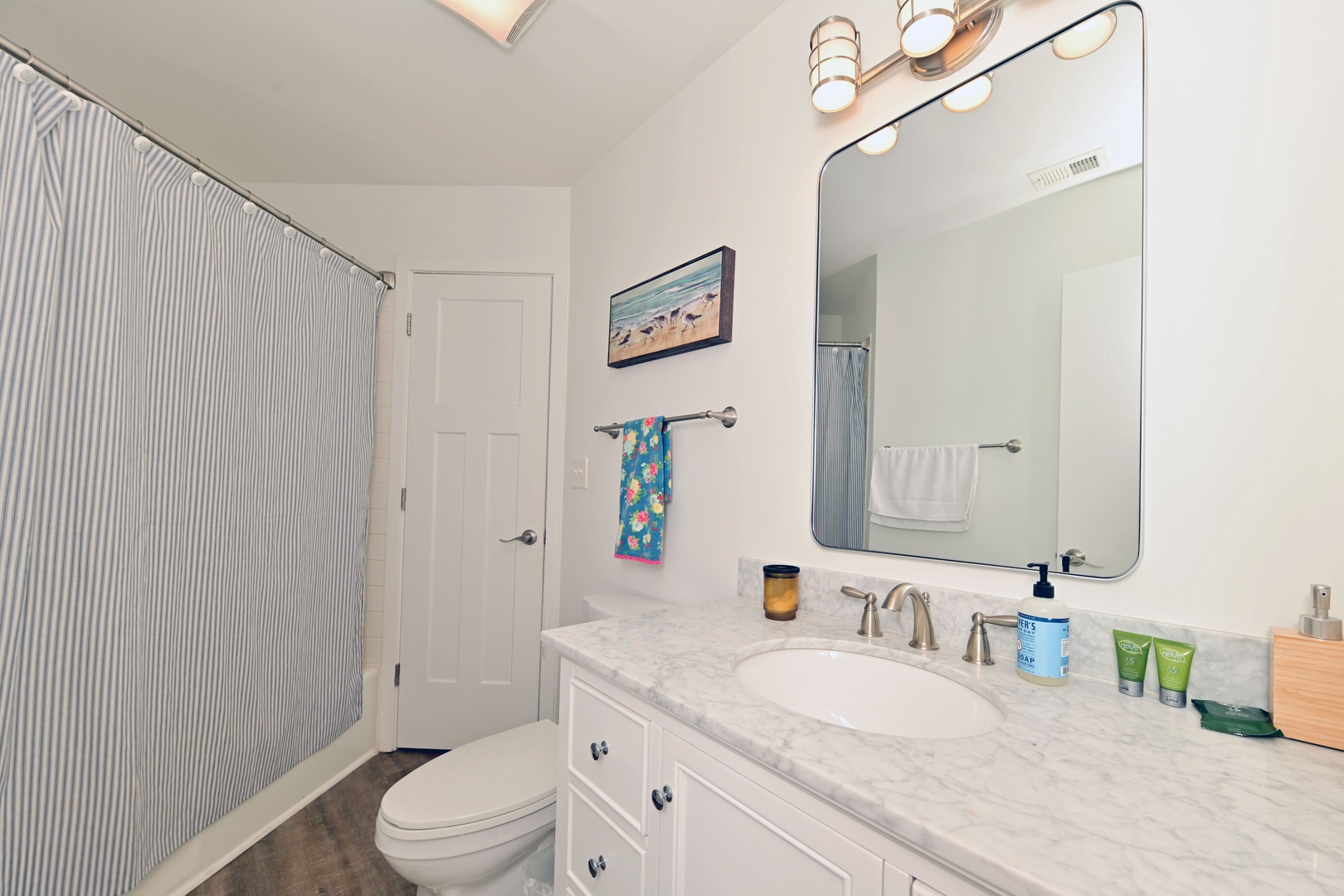 Full bathroom with a large vanity and tub-shower combo