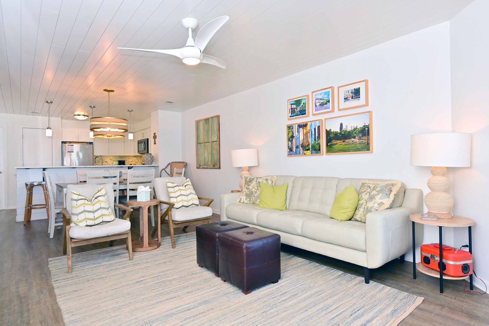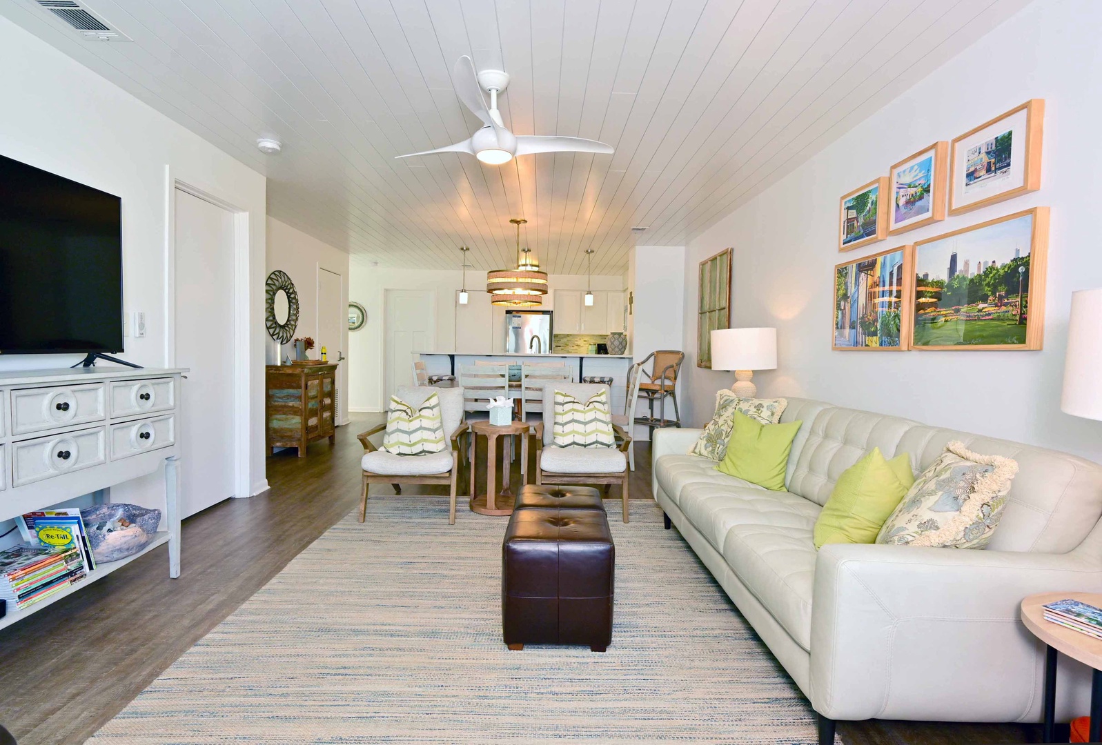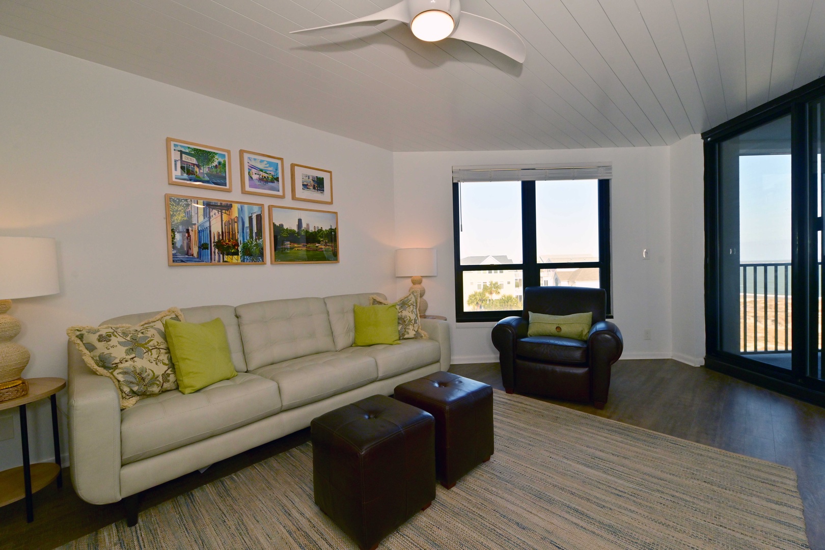 Bright living space with cozy seating, perfect for relaxing after a day at the beac