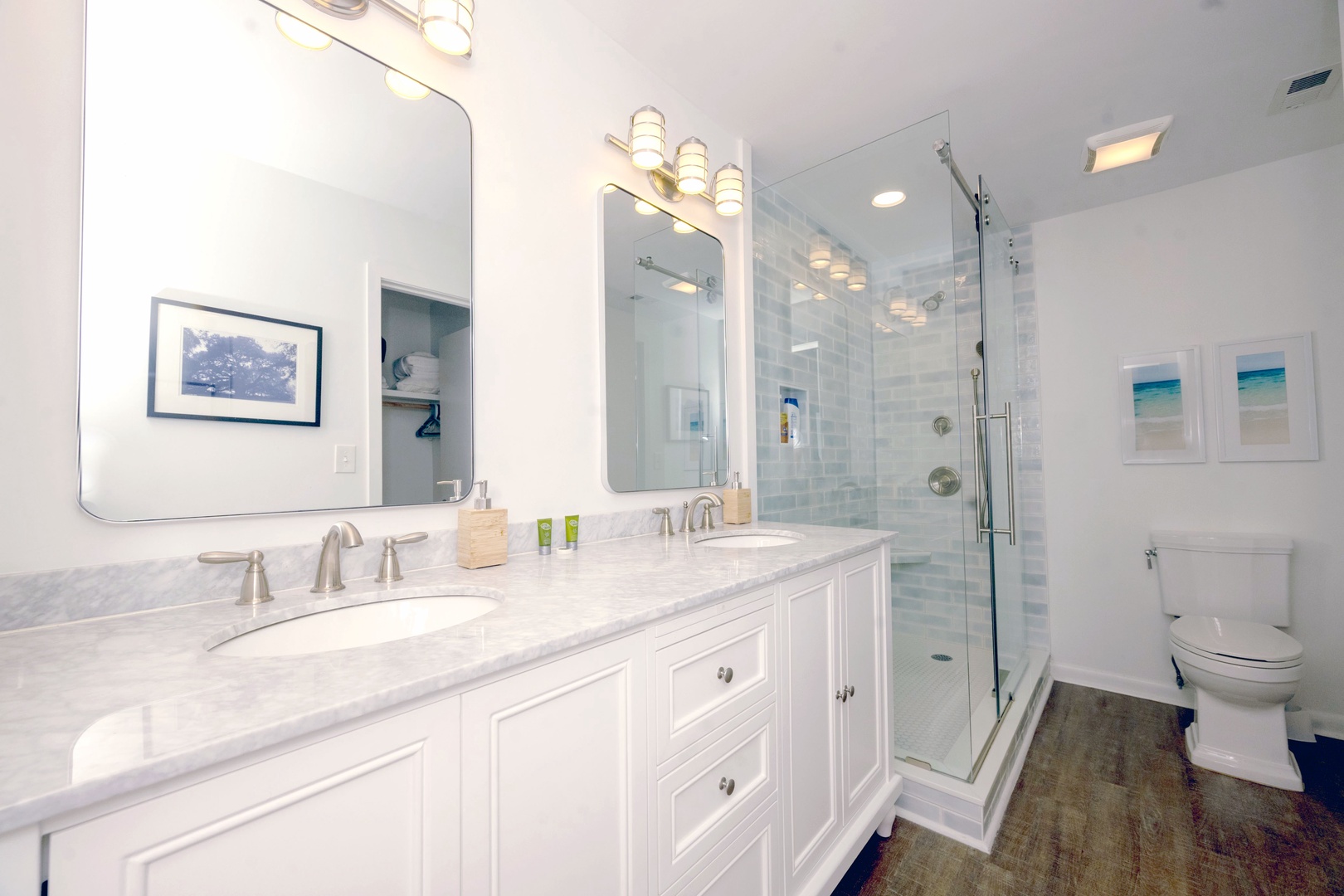 Spacious primary bathroom with double vanity and glass walk-in shower