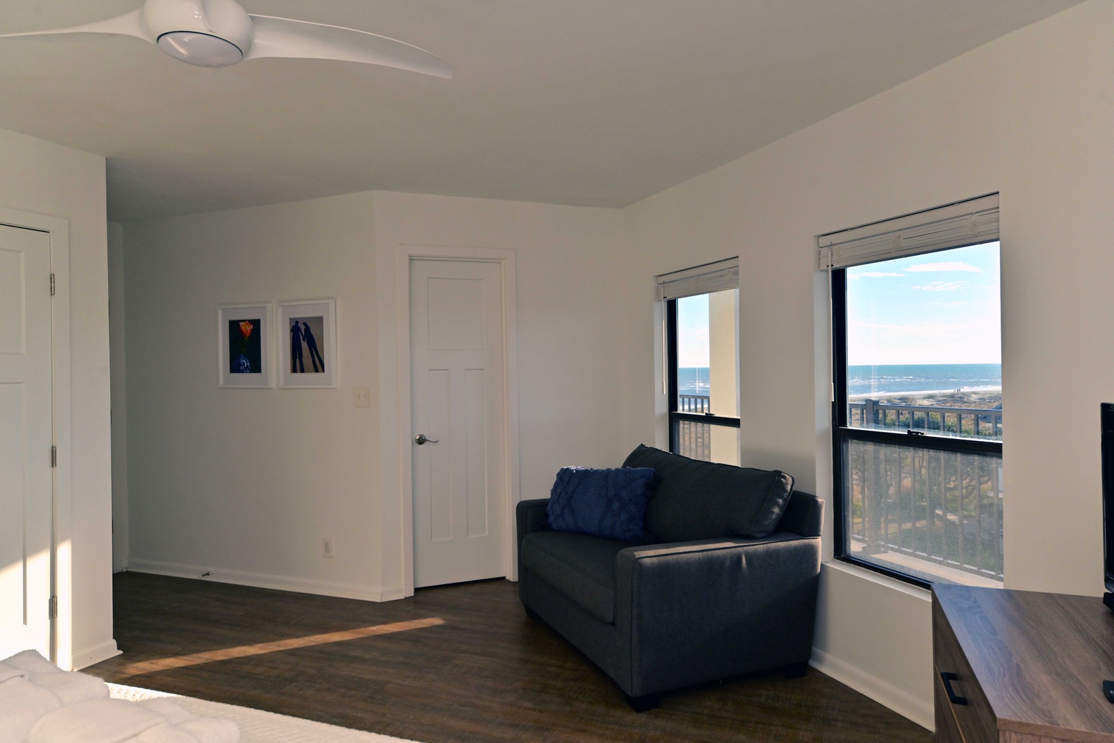 Spacious king bedroom with a sleeper sofa and ocean views through large windows