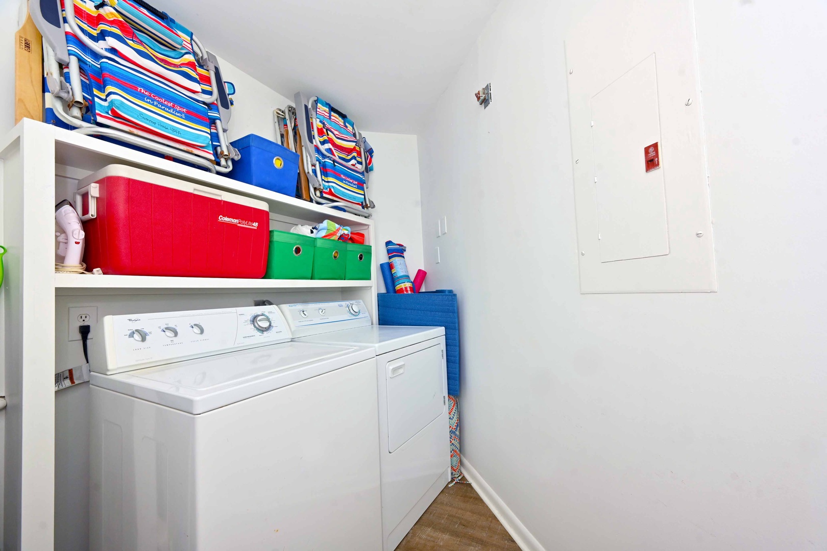 Convenient laundry area with washer, dryer, and storage for beach gear