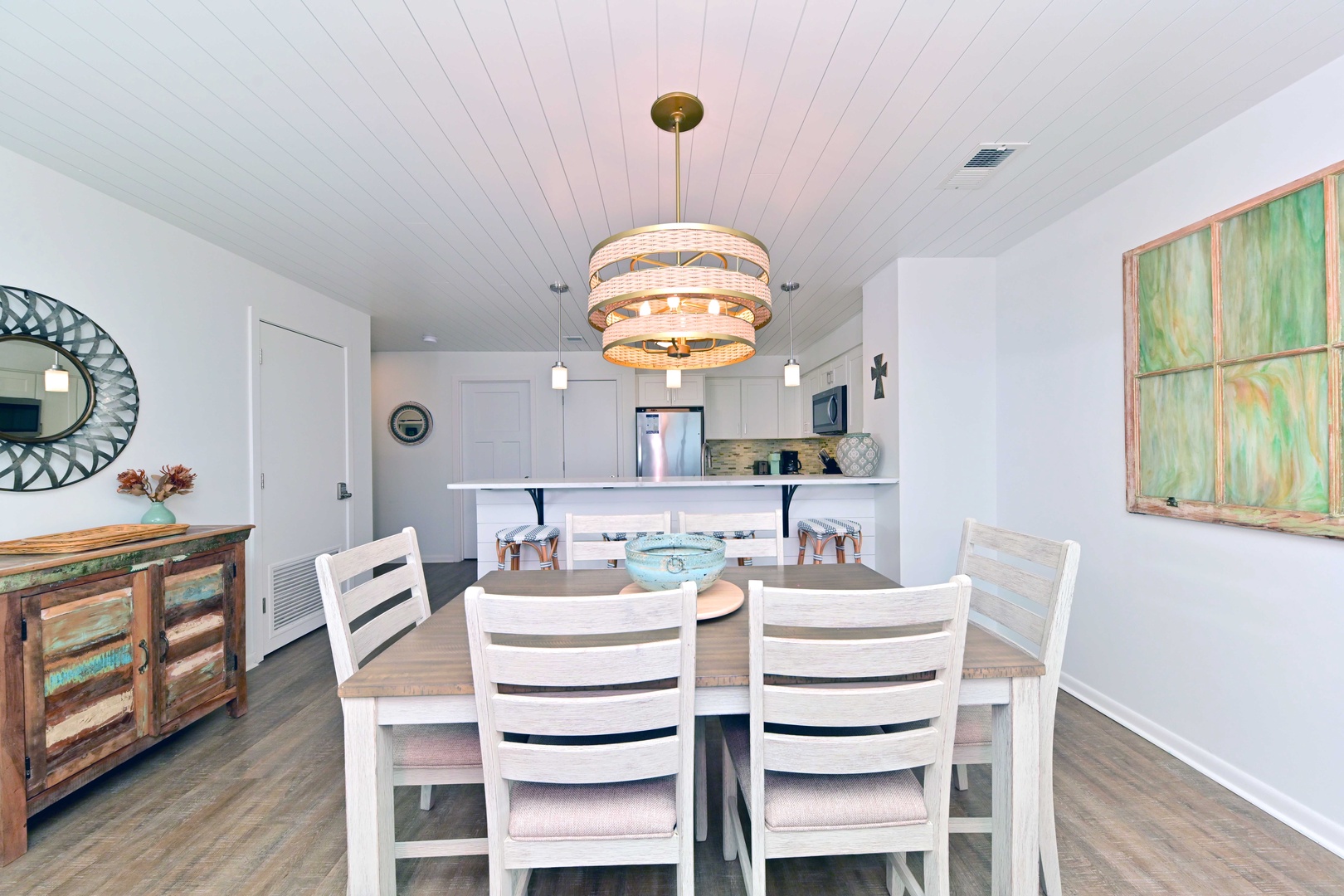 Spacious dining table conveniently located next to the kitchen and bar seating