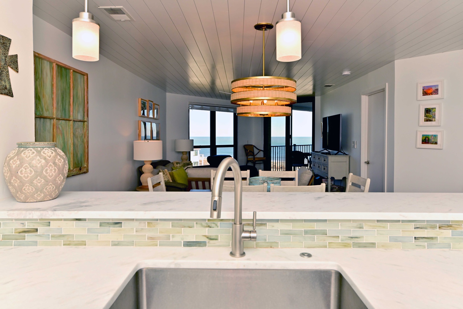 Spacious living room with plenty of comfortable seating for the whole family, where you can relax and take in stunning ocean views or enjoy a movie on the flat-screen TV. Access to the balcony from the living room invites you to sip your morning coffee while enjoying the ocean breeze.