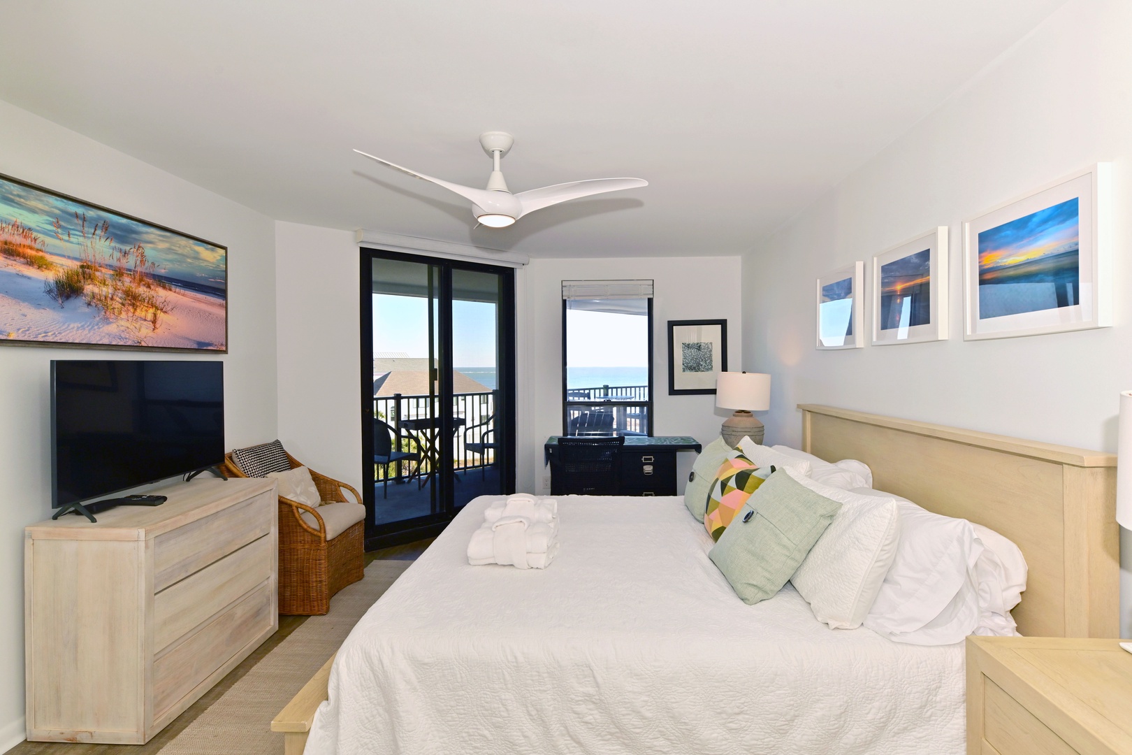 Spacious primary bedroom with a king bed and private balcony access with ocean views