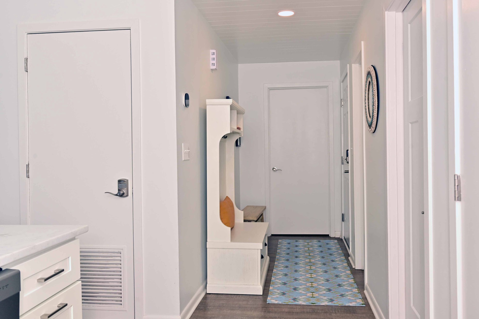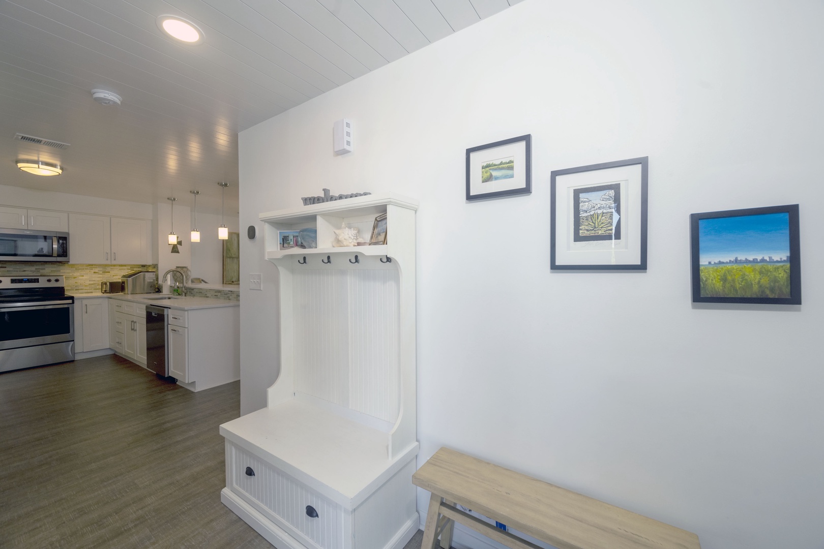 Welcoming entry foyer with bench seating and space to drop shoes and bags