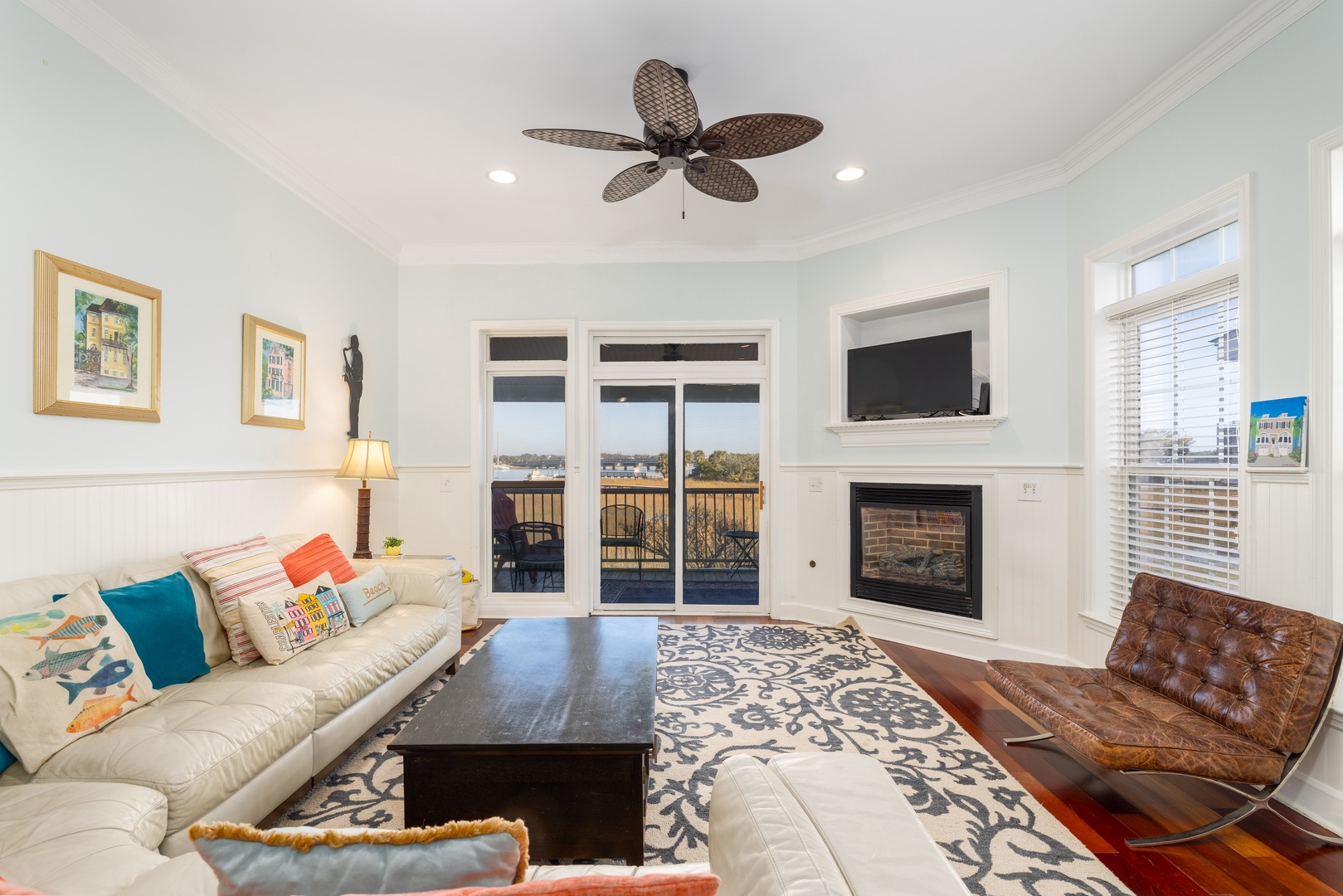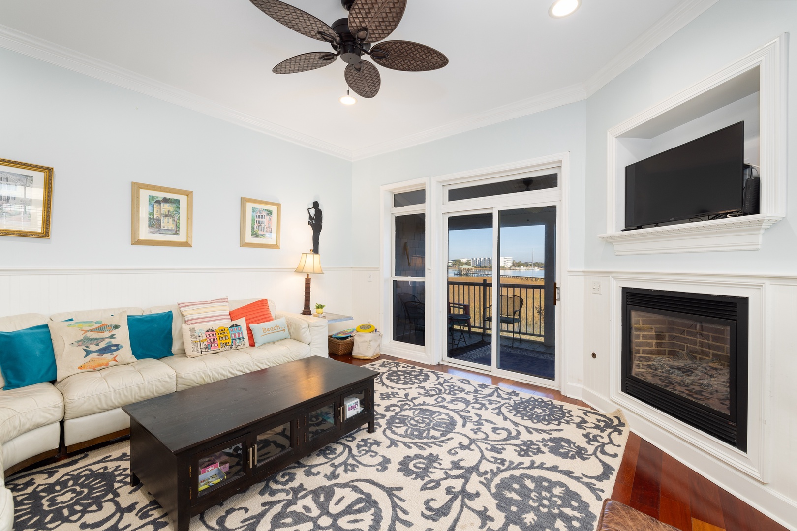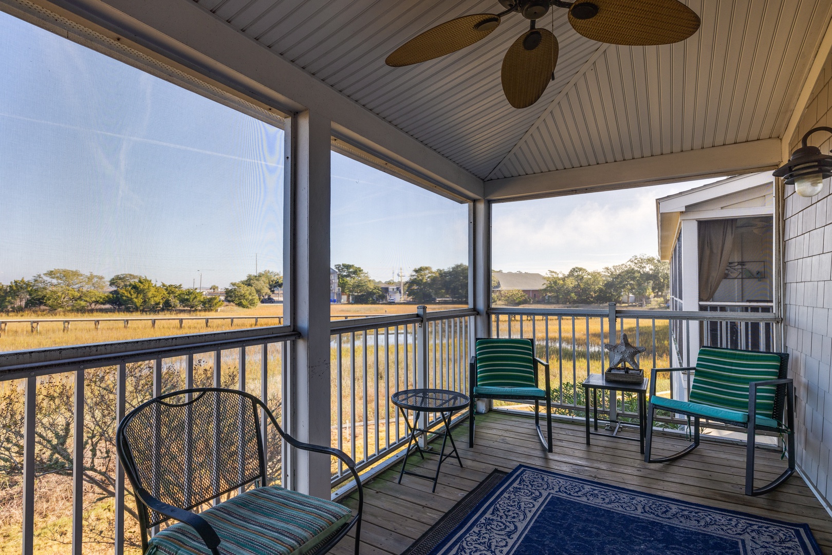 Enjoy an open and airy living space with ten-foot ceilings, beautiful hardwood floors, and water views from the screened porch. The living room is equipped with a flat-screen TV (streaming only), providing the perfect spot to relax after a day at the beach.