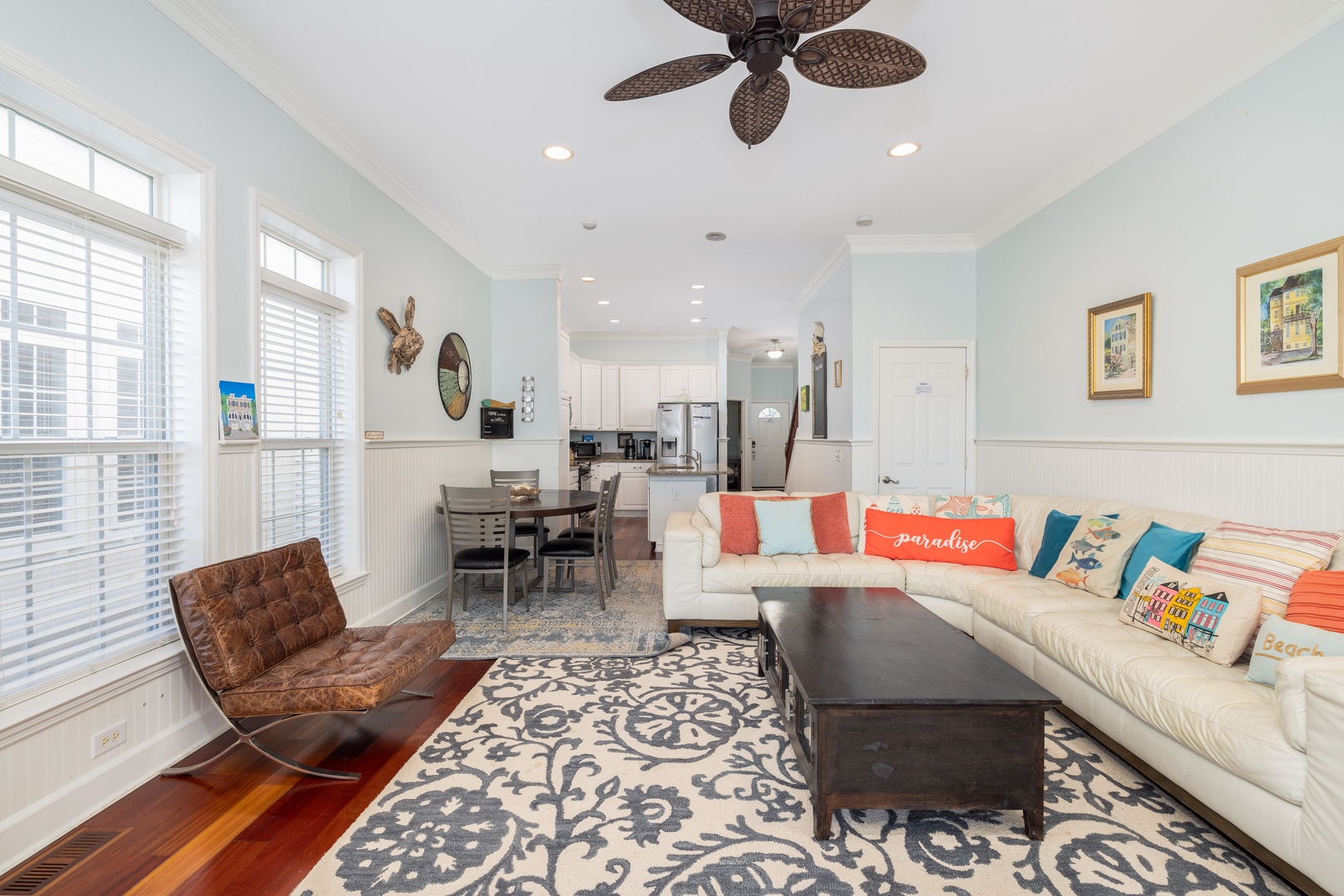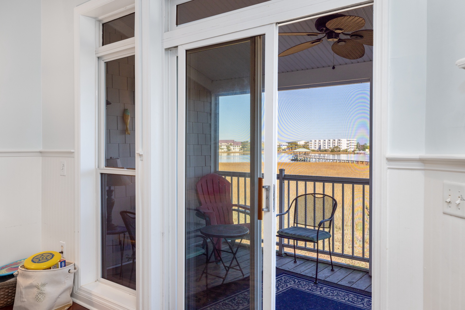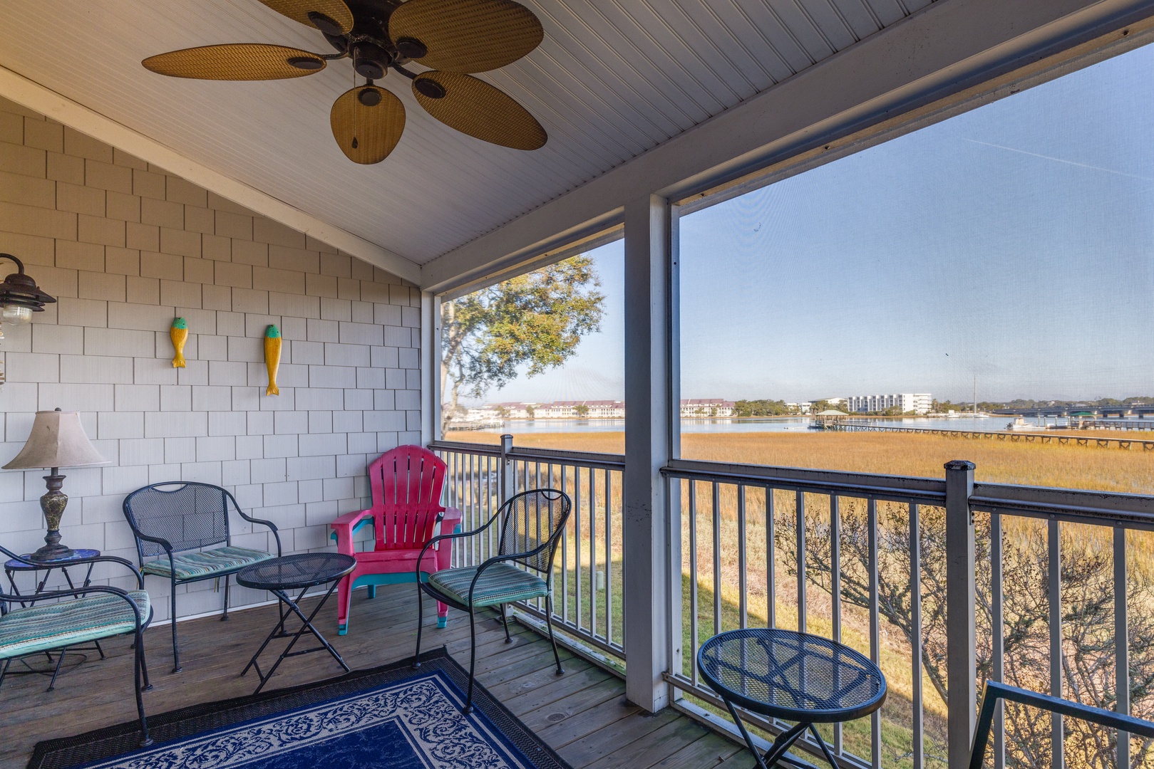 Enjoy an open and airy living space with ten-foot ceilings, beautiful hardwood floors, and water views from the screened porch. The living room is equipped with a flat-screen TV (streaming only), providing the perfect spot to relax after a day at the beach.