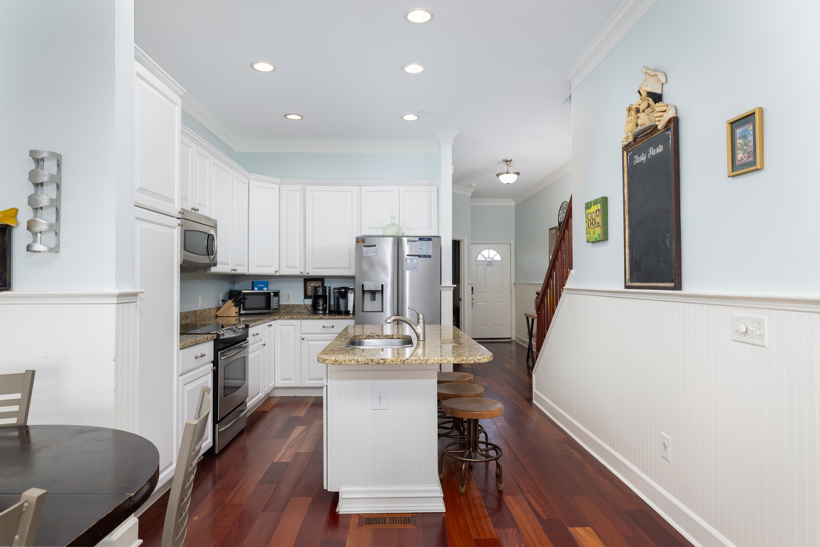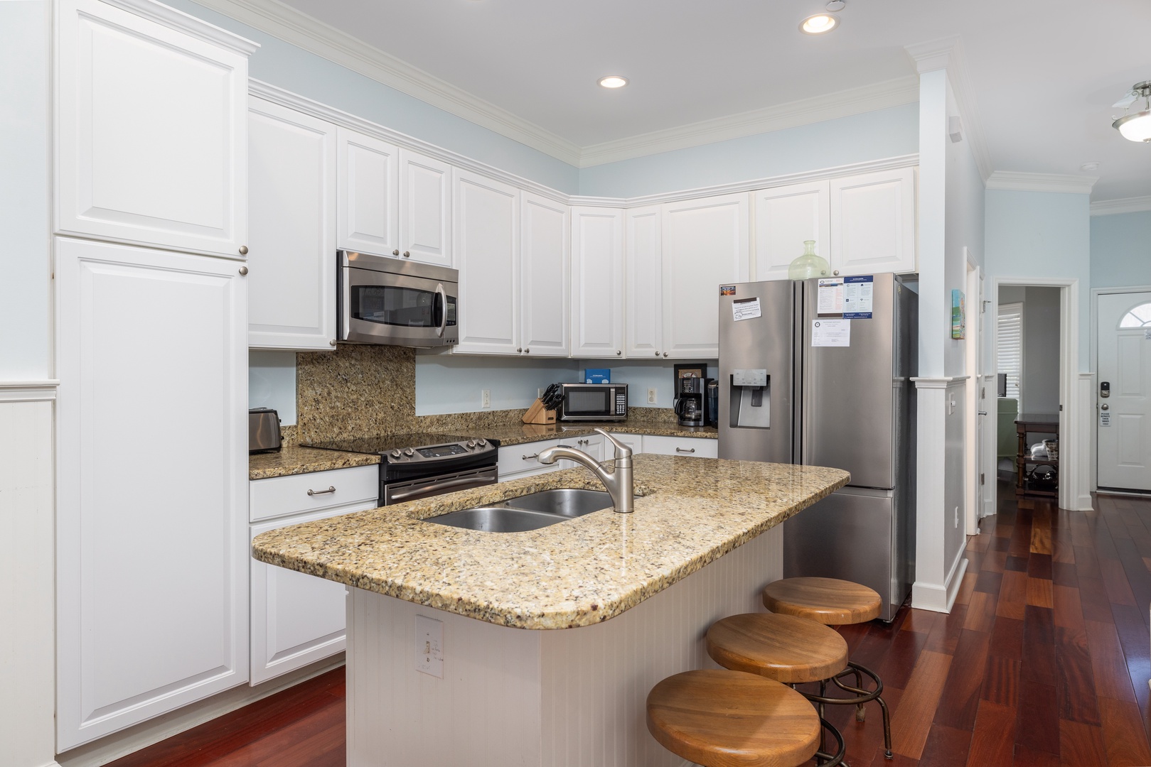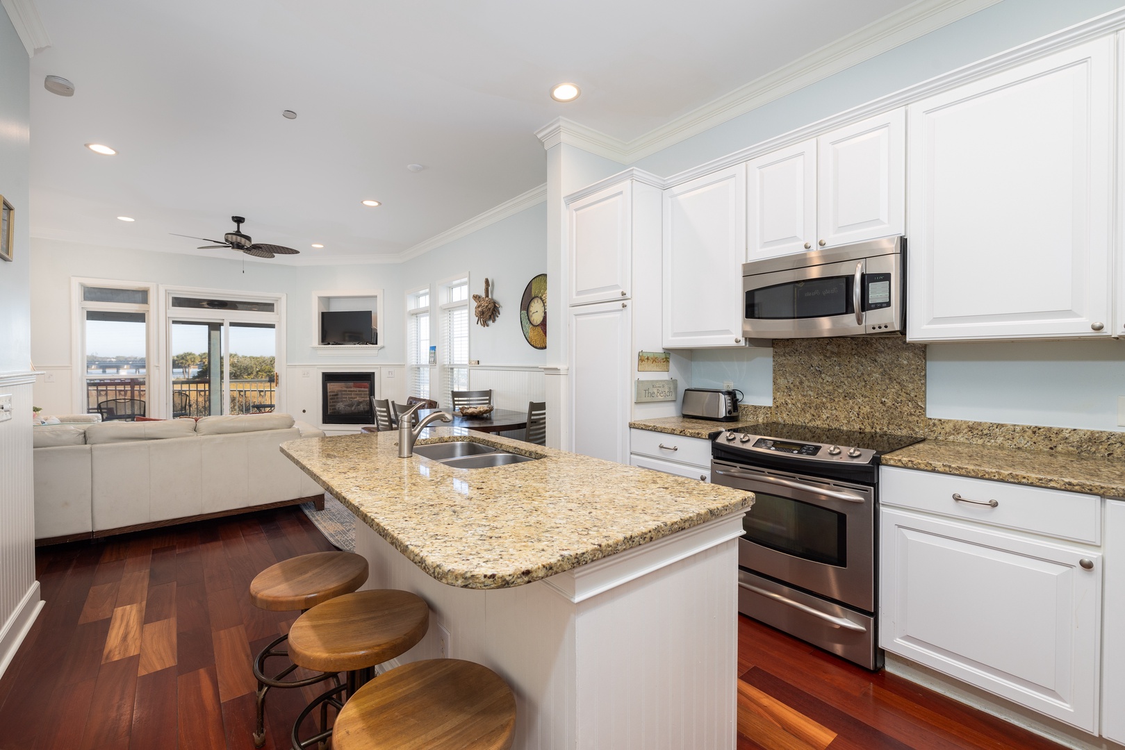 The fully equipped kitchen features granite countertops, stainless steel appliances, and everything you need to prepare meals for the group. A breakfast bar adds extra seating, making this space both functional and stylish.