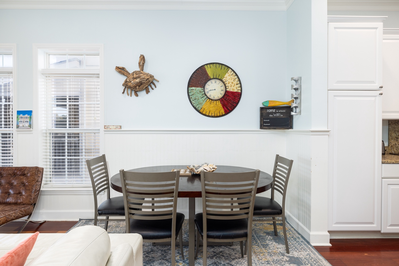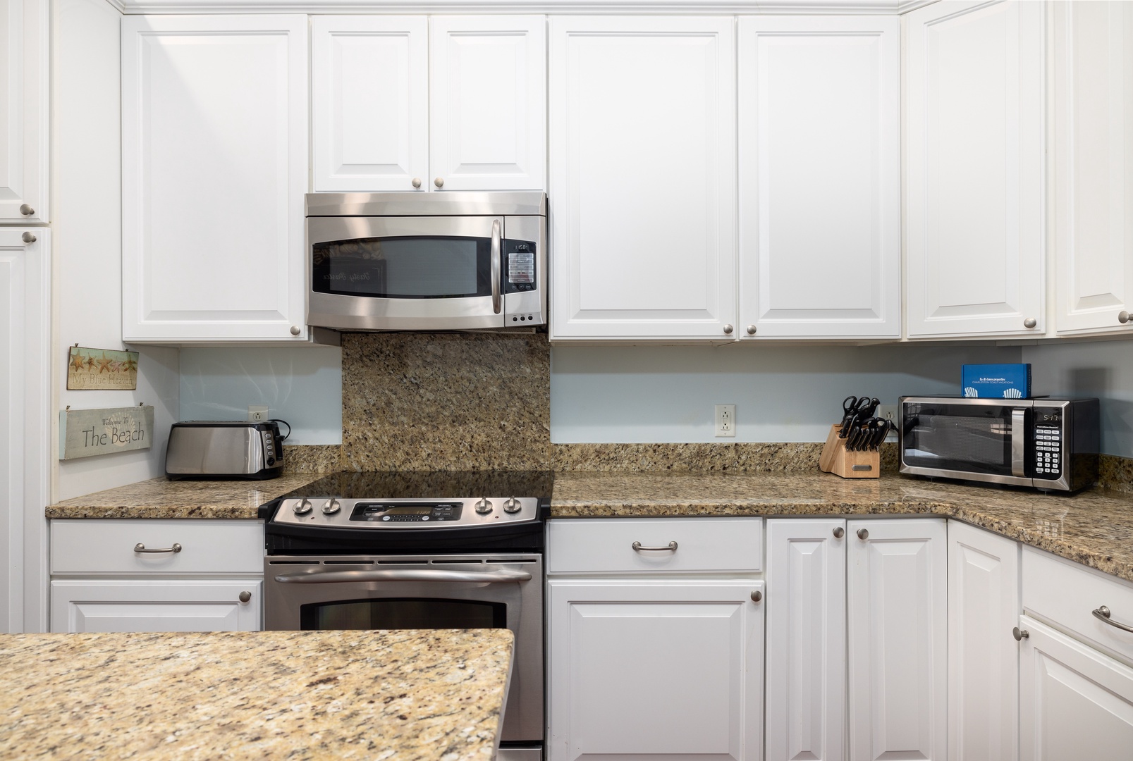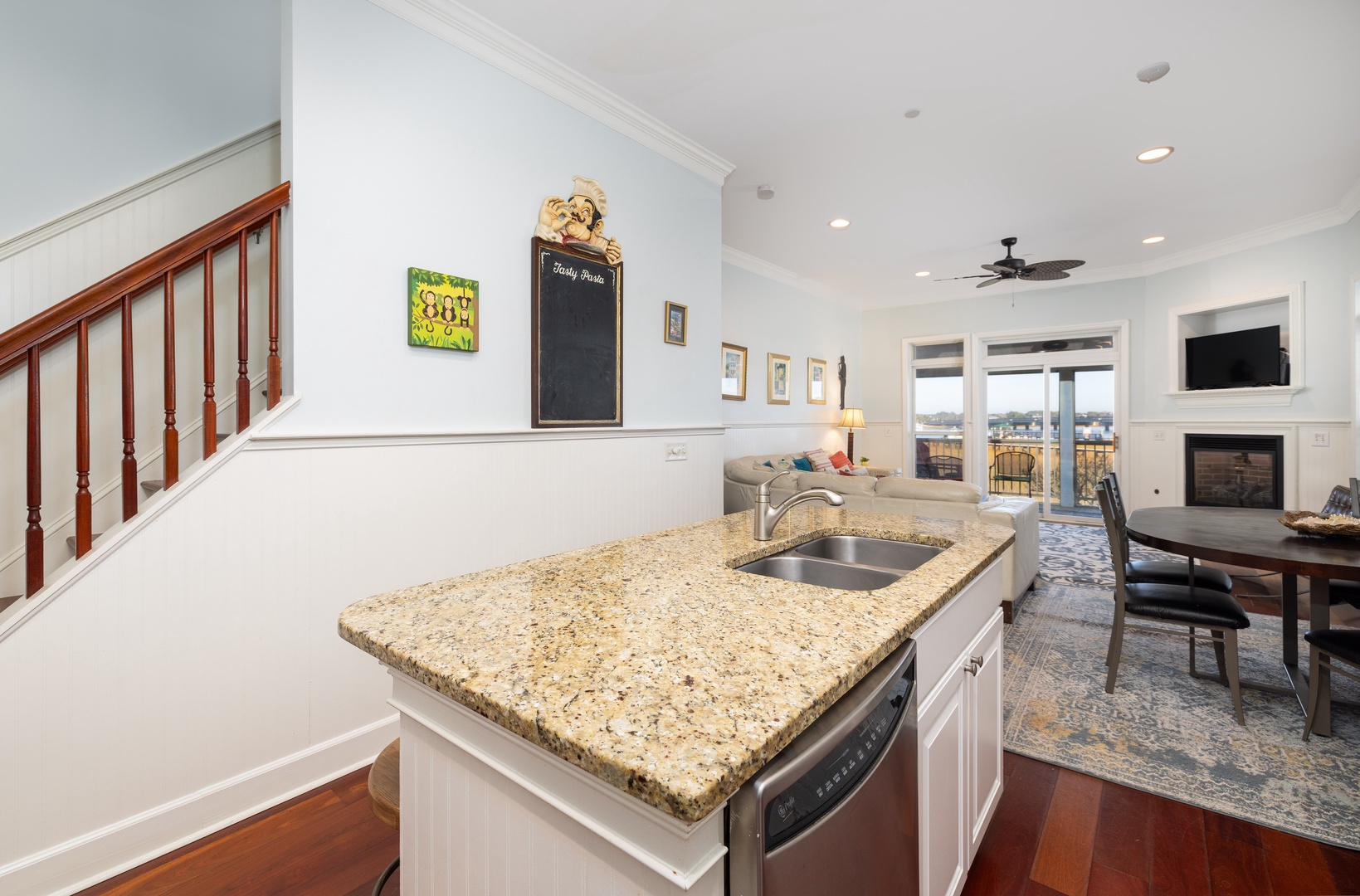The fully equipped kitchen features granite countertops, stainless steel appliances, and everything you need to prepare meals for the group. A breakfast bar adds extra seating, making this space both functional and stylish.