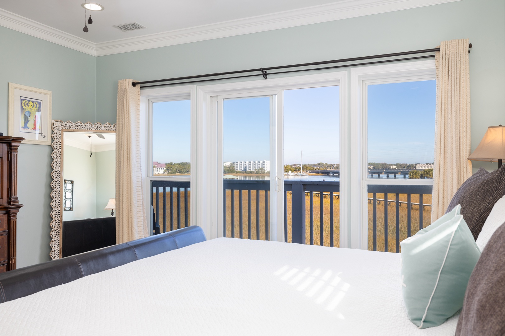 Master Bedroom: King-size bed, en-suite bathroom with separate shower, walk-in closet, and a private balcony with water views.